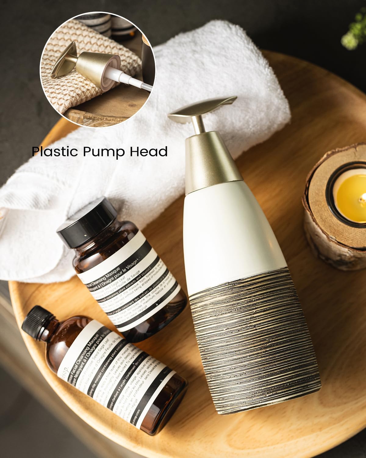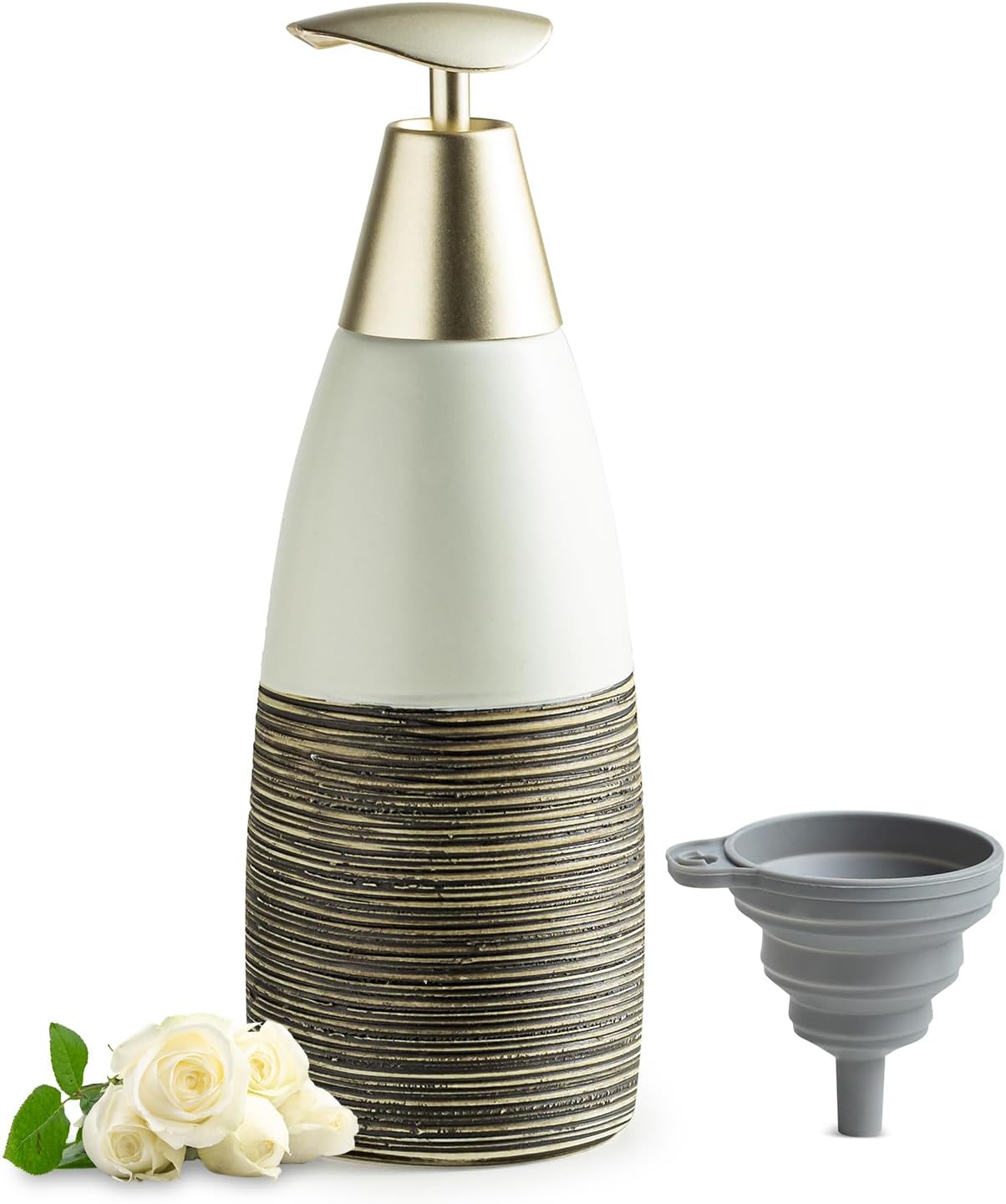 - Sophisticated Design: The stylish tapered cone design paired with a gold plastic pump head adds a touch of luxury to your countertop. It’s not just stylish but also highly functional for easy dispensing of your favorite lotions, shampoos, or body washes