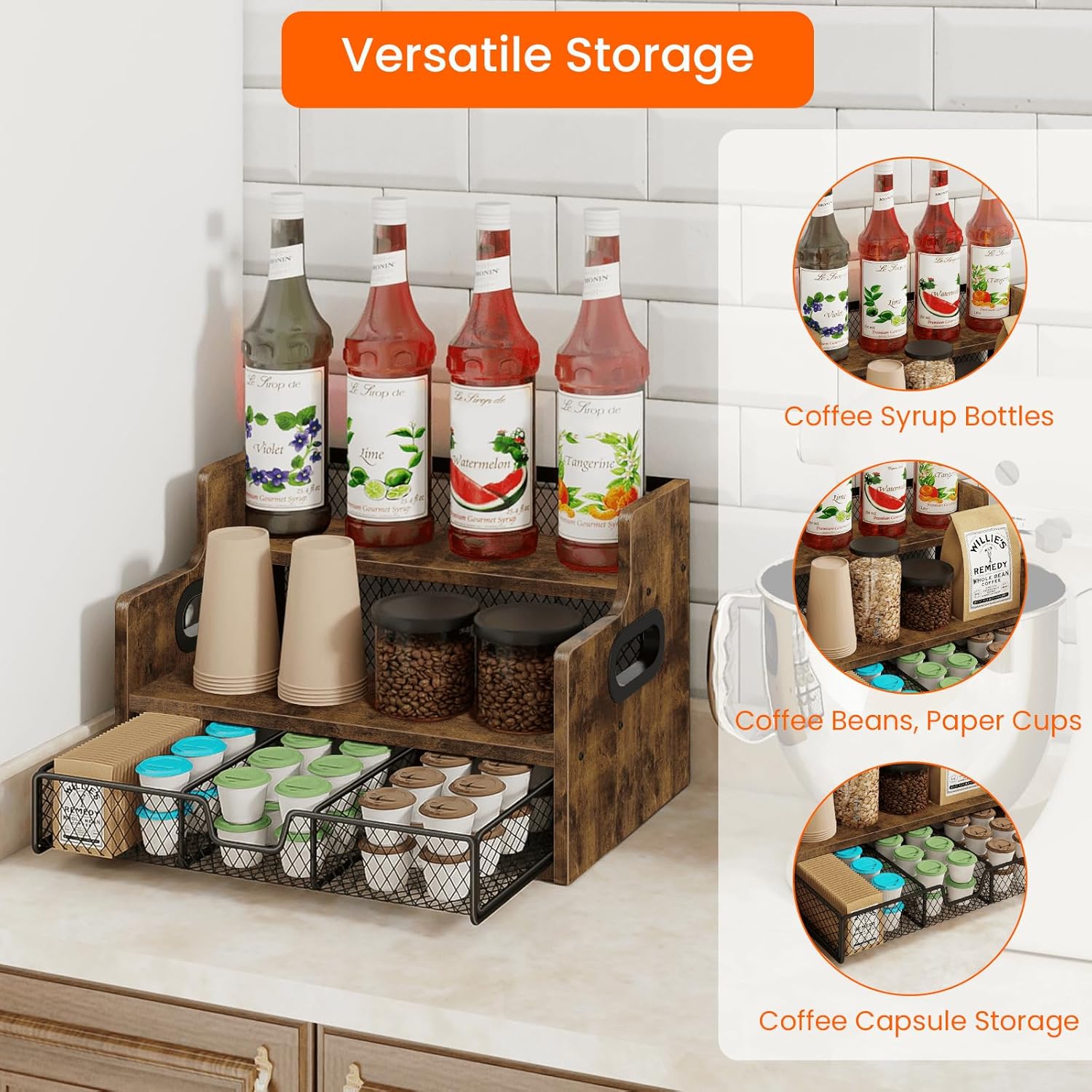 Homode Coffee Syrup Rack Organizer, 3-Tier 8 Bottles Syrup Holder Stand with 35 K Cup Storage Basket Drawer for Coffee Bar, Wood Liquor Shelf Wine Rack Countertop for Home, Rustic Brown