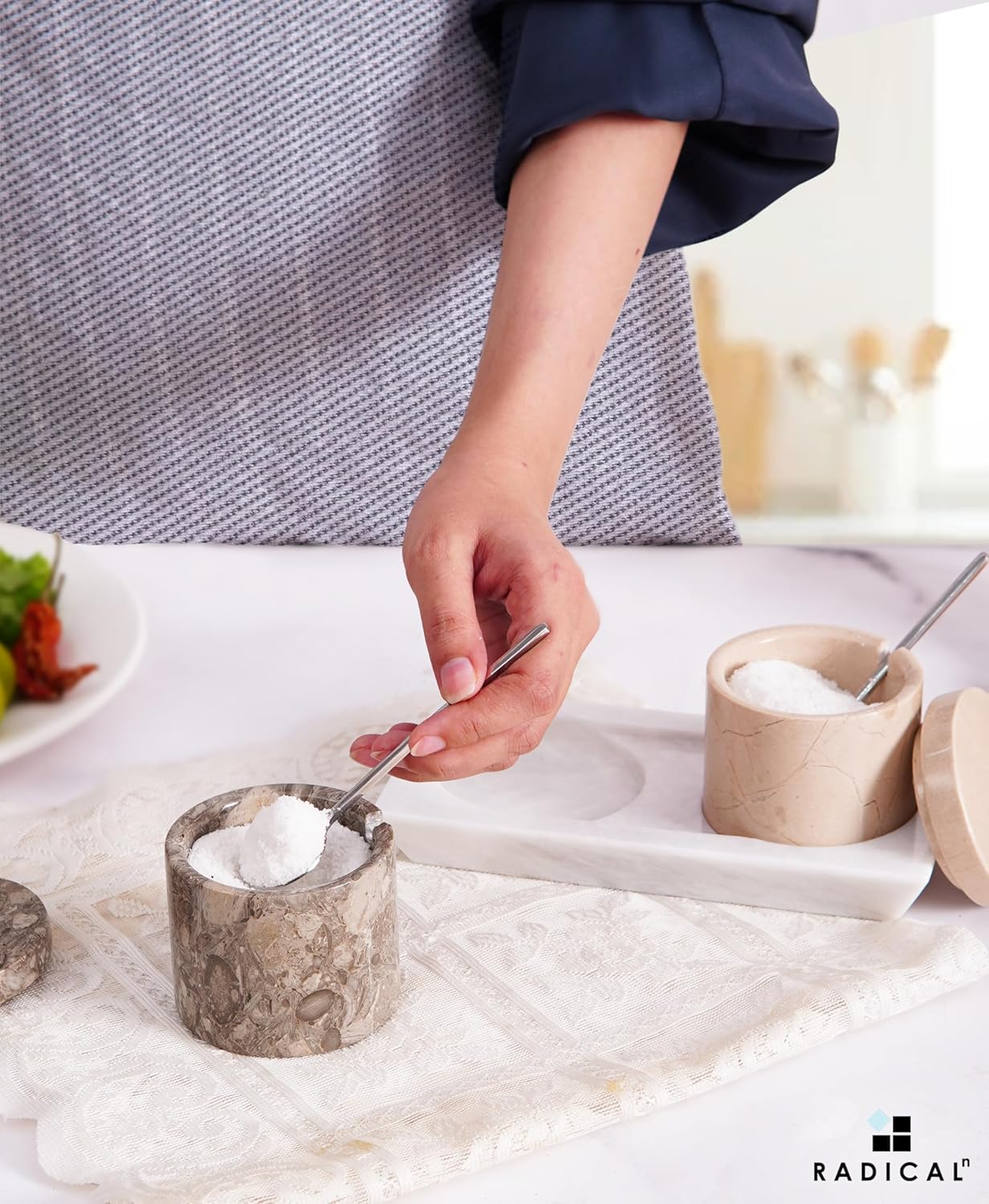 - WHAT IS INCLUDED - Set of 2 Salt Cellars With Spoon and 1x Tray. Comes along with RADICALn Branded Secure & Fragile Packaging.