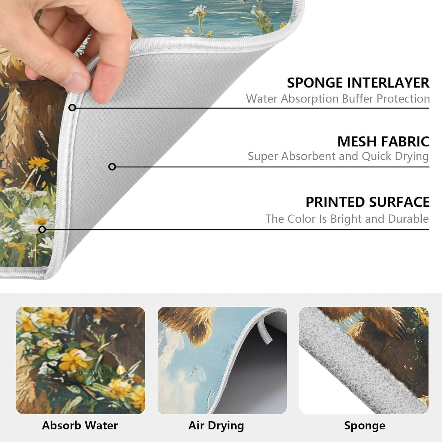 - Exquisite workmanship: This dish drying mat with durable and neatly sewing around the edge helps contain spills, the stitches don't fall off so that they are reversible for convenience and optimal performance, but one-sided printing, matchs delicate dishes and stemware, bring decorations to your home or kitchen, keeping tables clean, the soft and foldable material is easy to store, this dry pad has a lanyard design, which can be hung up when you are not in use and does not take up space