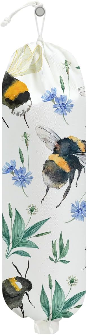 Bee Plastic Bag Holder, Wall Mount Grocery Bag Holder, Plastic Storage bag, Pull Rope Free Adjustment, Plastic Bag Holders for Grocery Bags, Plastic Bag Dispenser for Home Kitchen