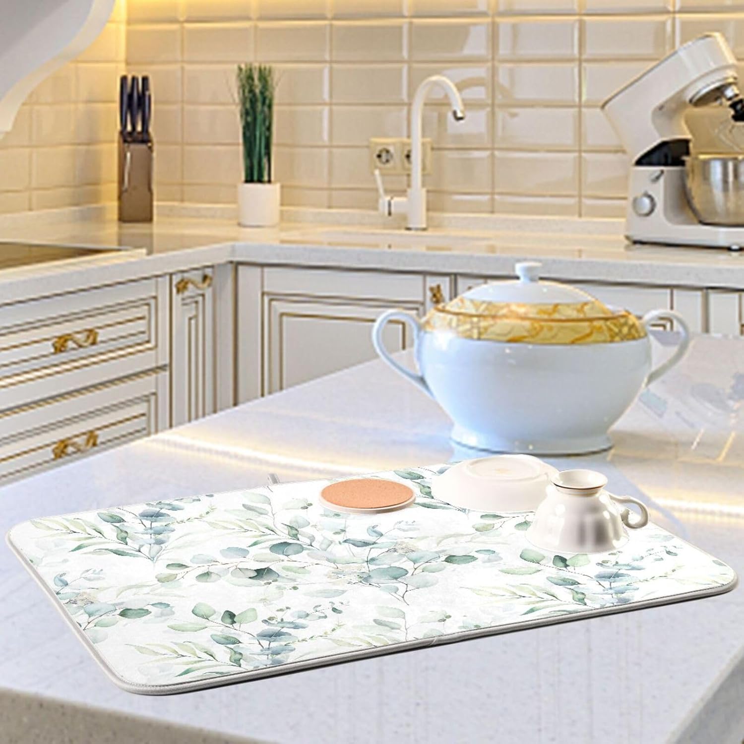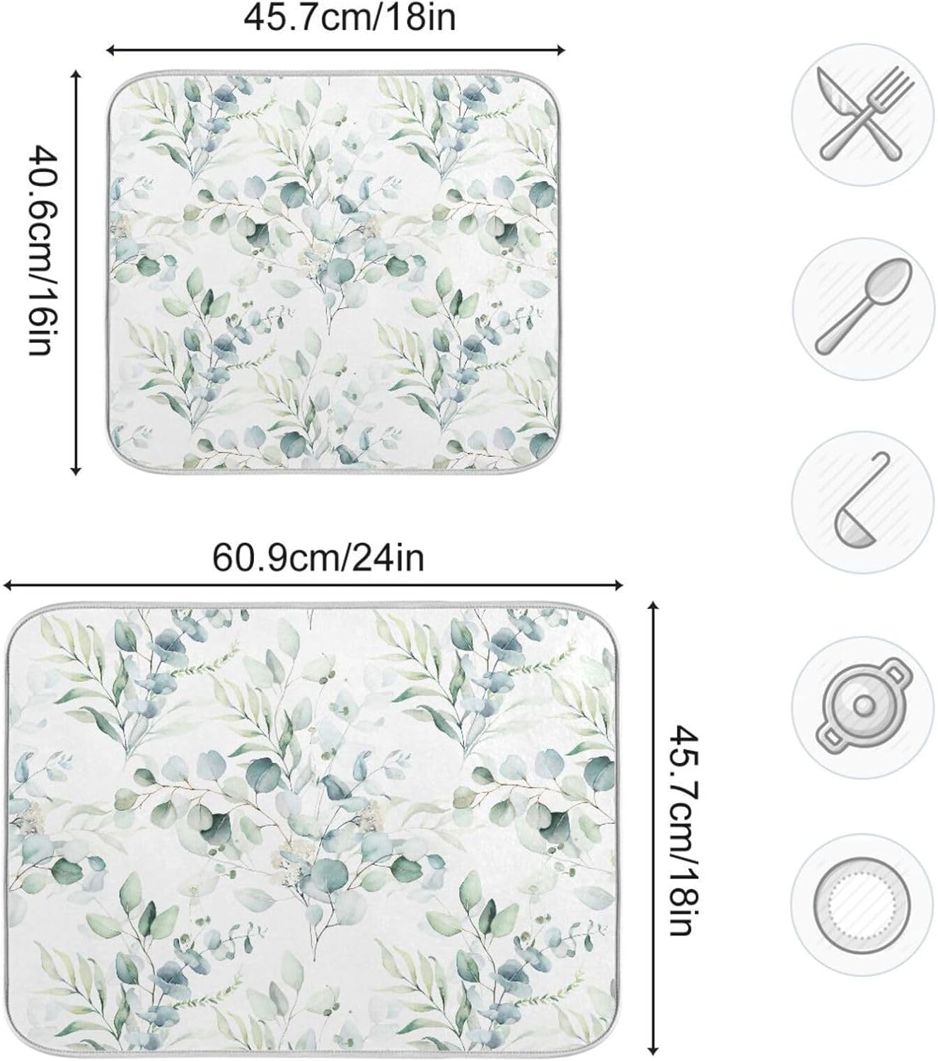 Green Sage Eucalyptus Leaves Dish Drying Mat for Kitchen Counter Absorbent Microfiber Drying Pad, Medium 16x18 in, Reversible Drainer Mats