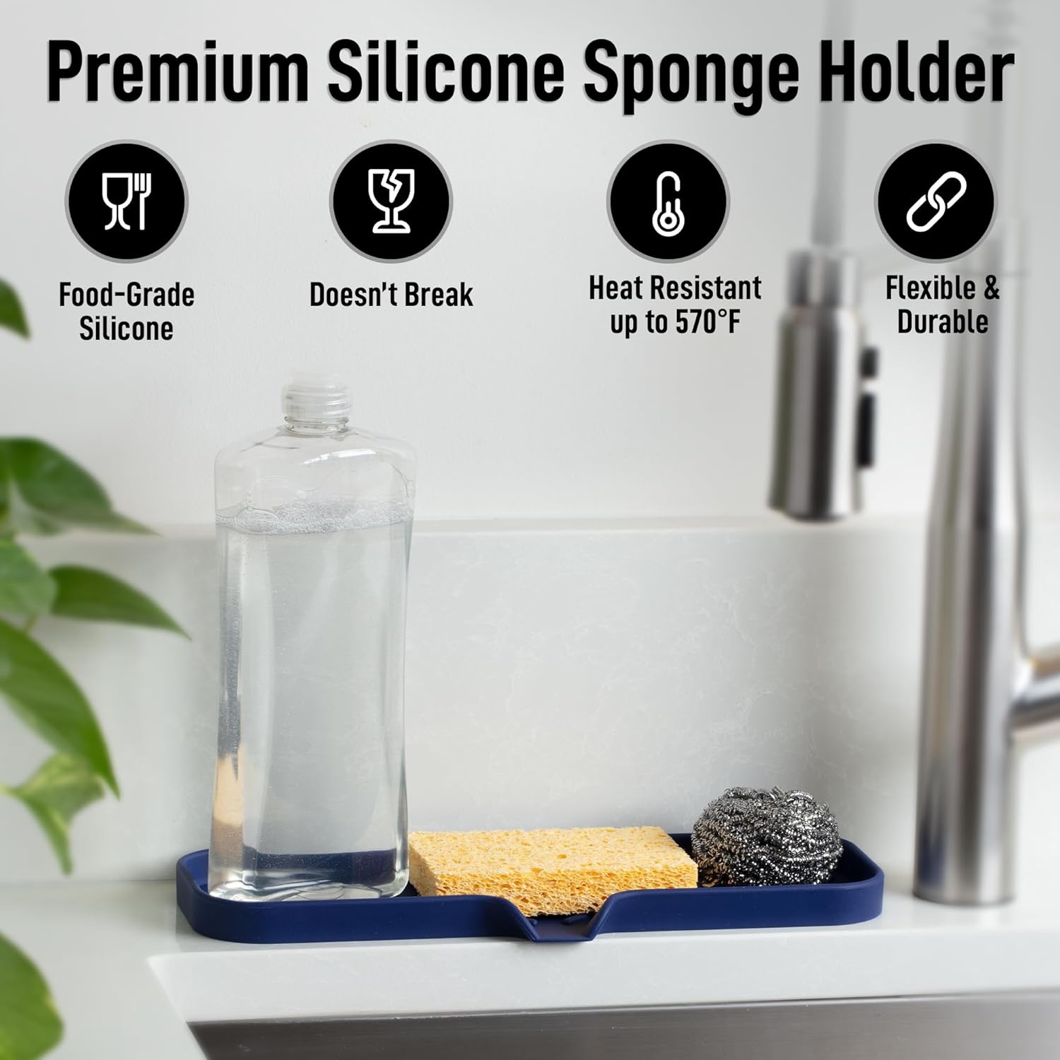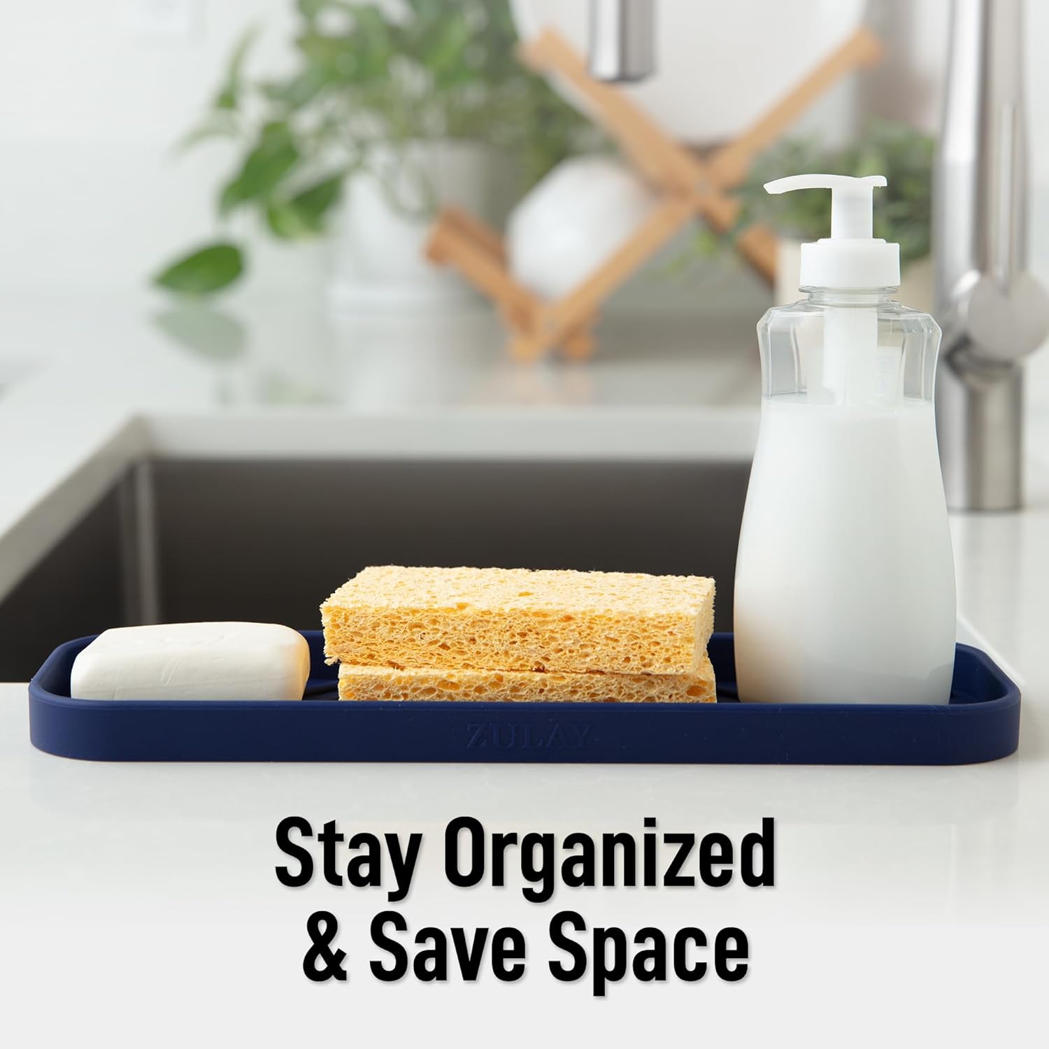 Zulay Kitchen Large Silicone Sponge Holder (12x4) – Flexible Sink Organizer Tray for Kitchen & Bathroom – Multipurpose Soap Dish for Sponges, Makeup, Trinkets & More (Dark Blue)