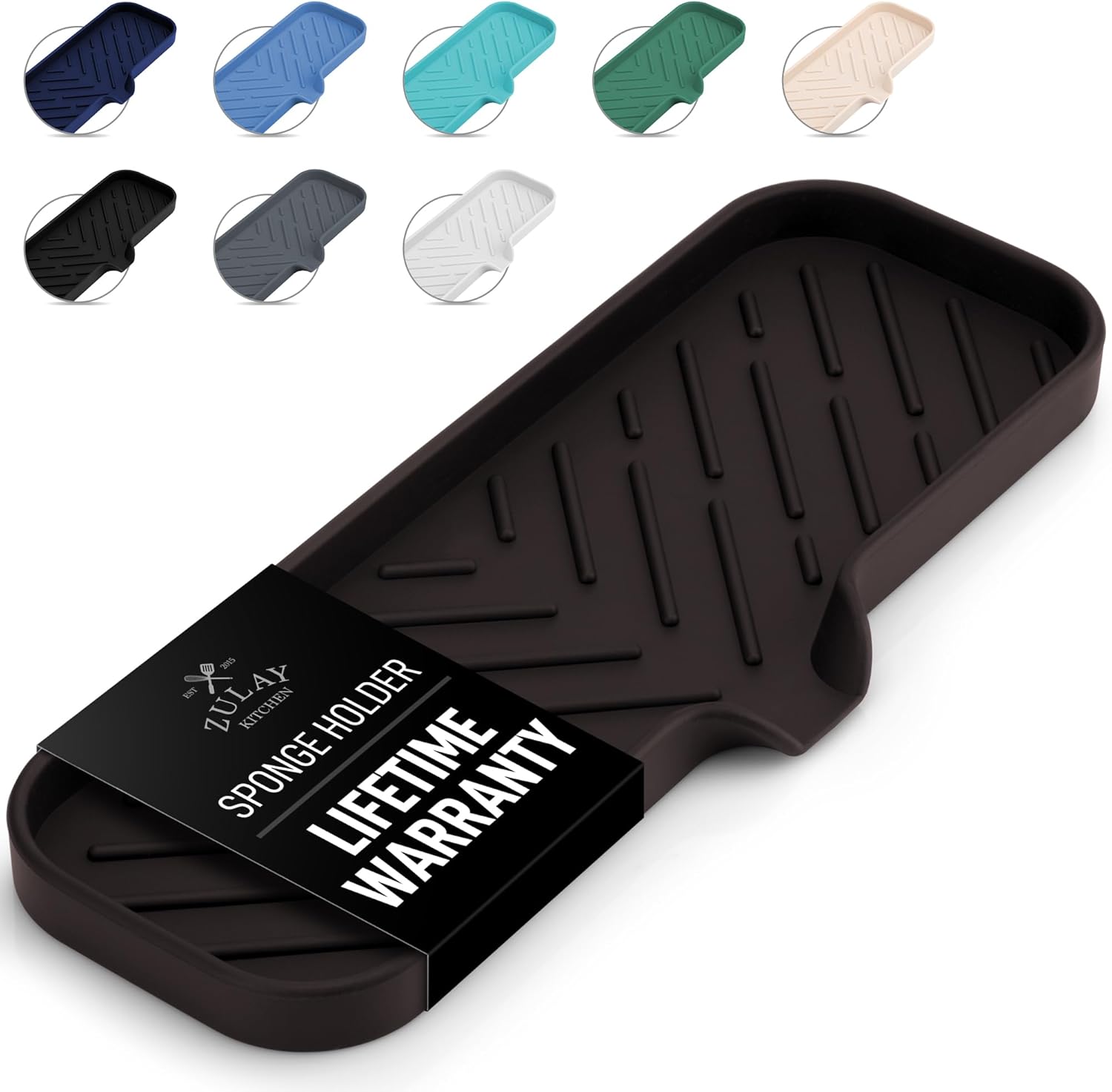 Zulay Kitchen Large Silicone Sponge Holder (12x4) – Flexible Sink Organizer Tray for Kitchen & Bathroom – Multipurpose Soap Dish for Sponges, Makeup, Trinkets & More (Chocolate)