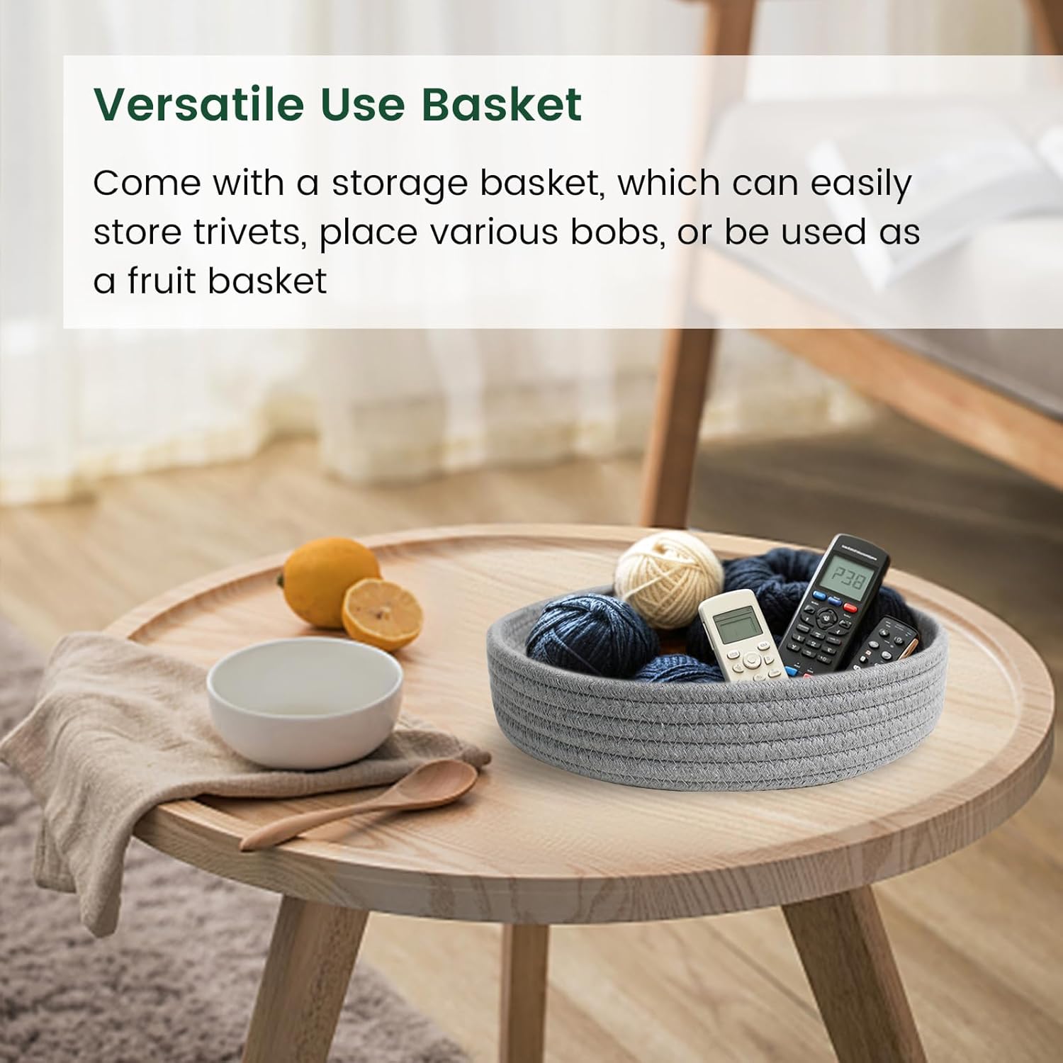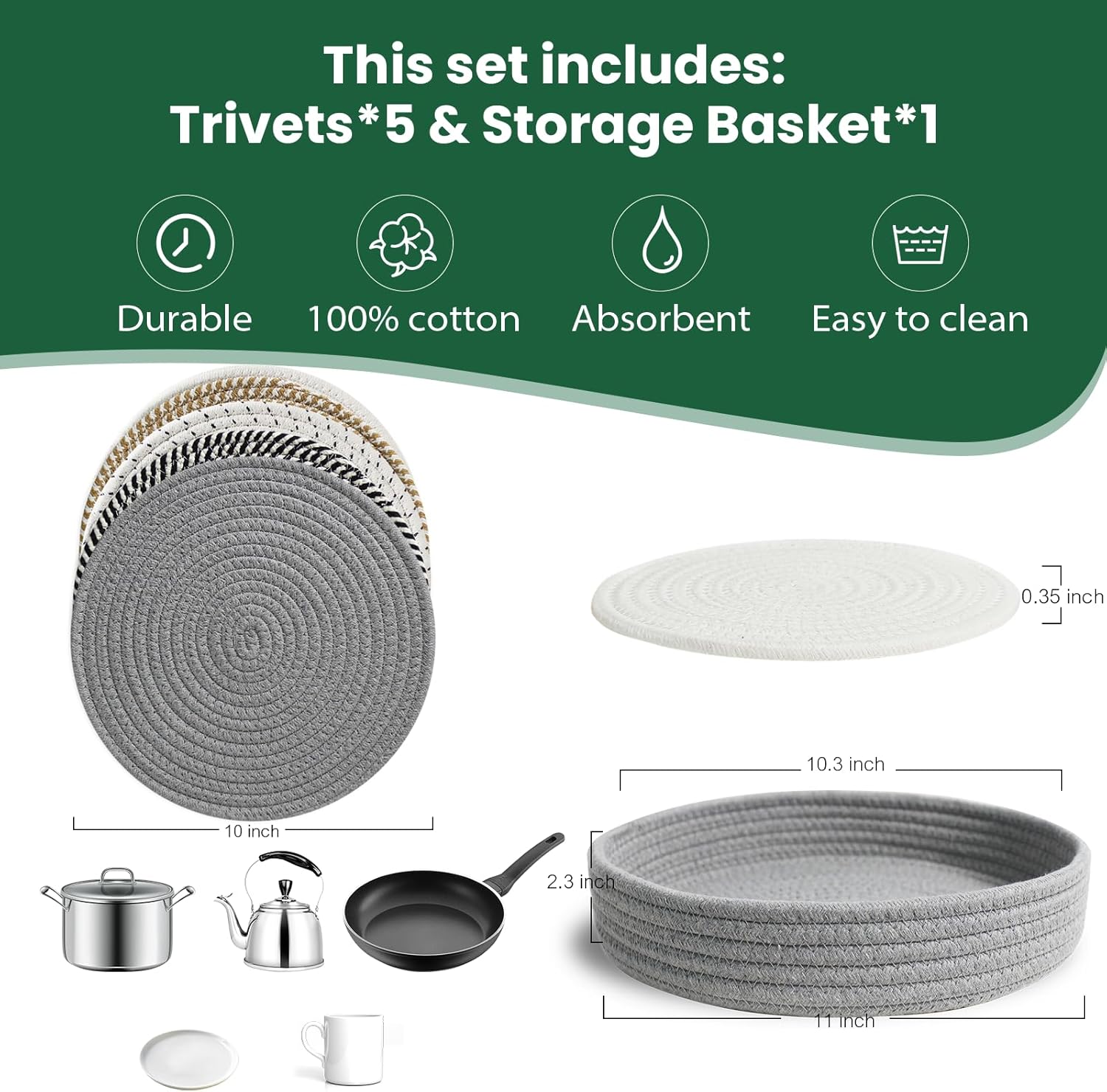 - Trivets Set: Our trivet set includes 5 hot dish trivets in different colors, 10 inches in diameter and 0.35 inches thick. Comes with 10.3 inches diameter storage basket, great for storing those pot holders. Also great used as hold keys, remote controls, pens, stationary, supplies, etc. or be used as a fruit basket