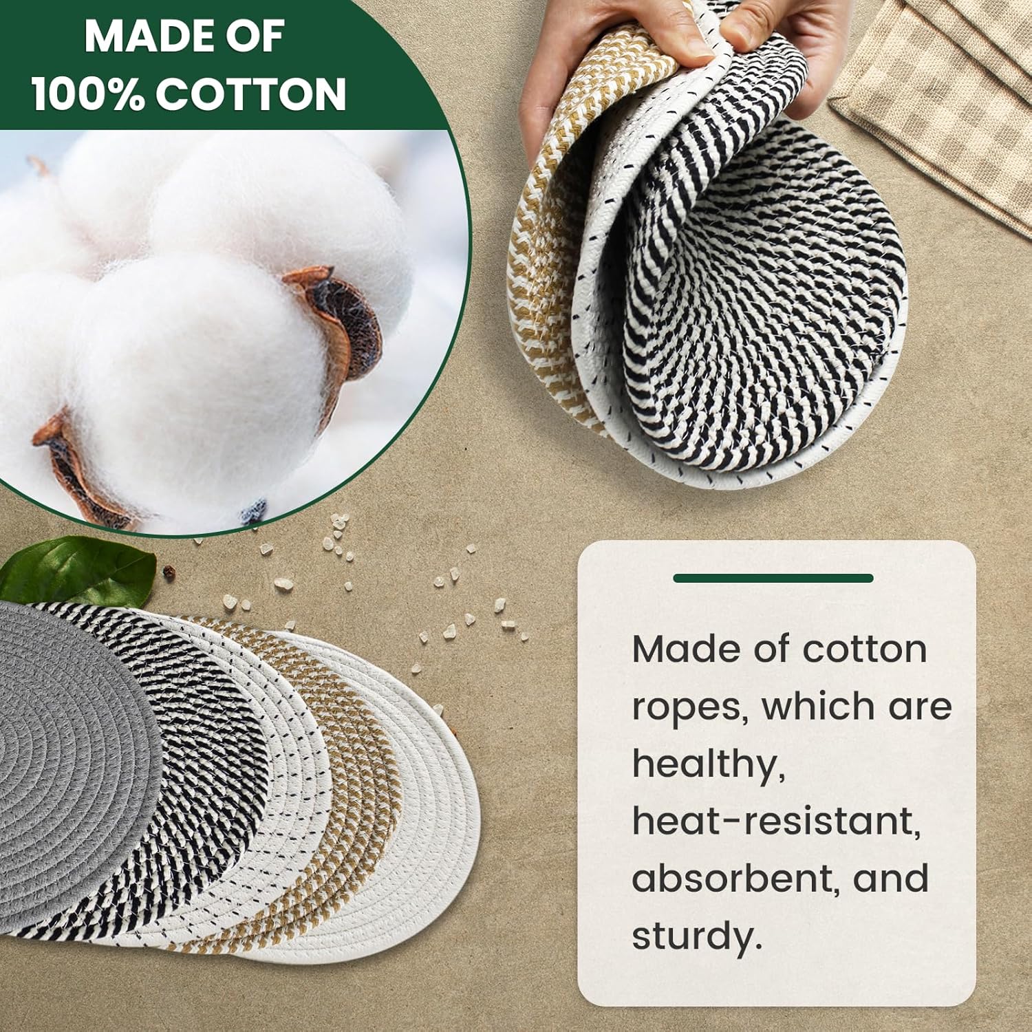 - Exceptional Heat Protection: These trivets are handwoven from 100% cotton thread. Withstand up to 356°F, shielding your kitchen table, countertop, or home decor from hot pots, dishes, and heat damage