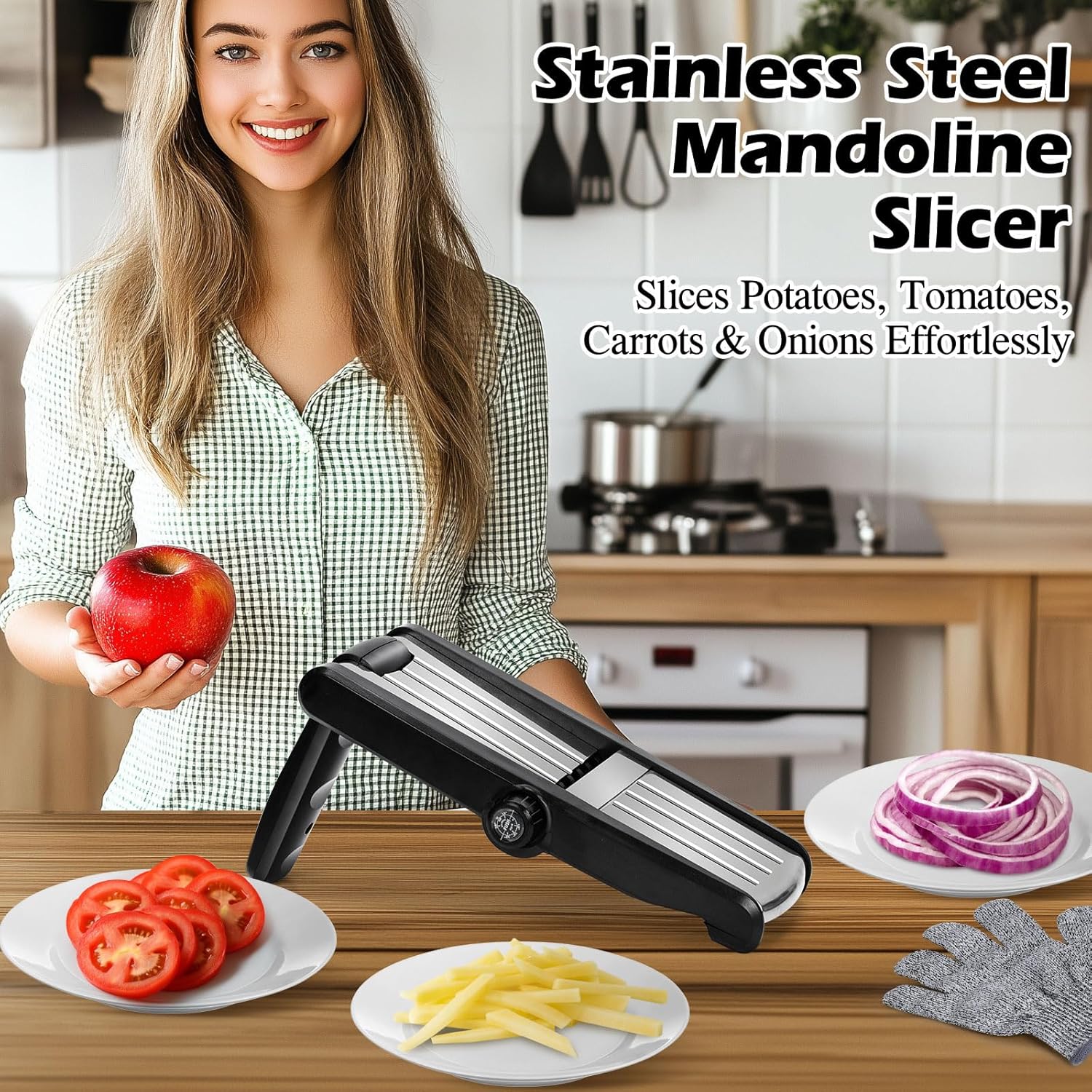 MASTERTOP Mandoline Slicer, 5 in 1 Mandoline Food Slicer for Kitchen,Stainless Steel Mini Vegetable Slicer with Safety Glove & Cleaning Brush,Adjustable Vegetable Chopper for Potatoes