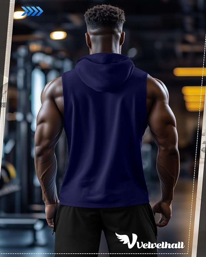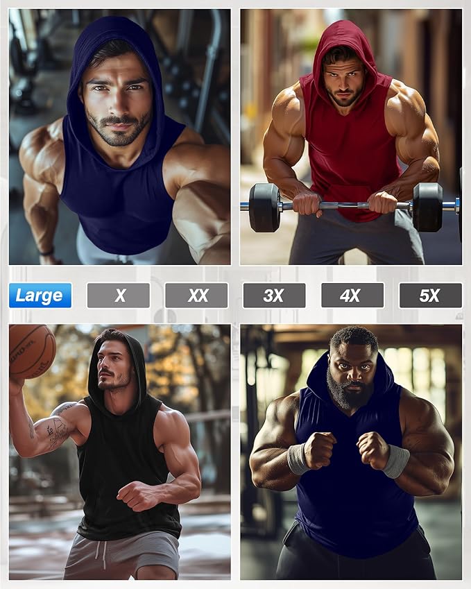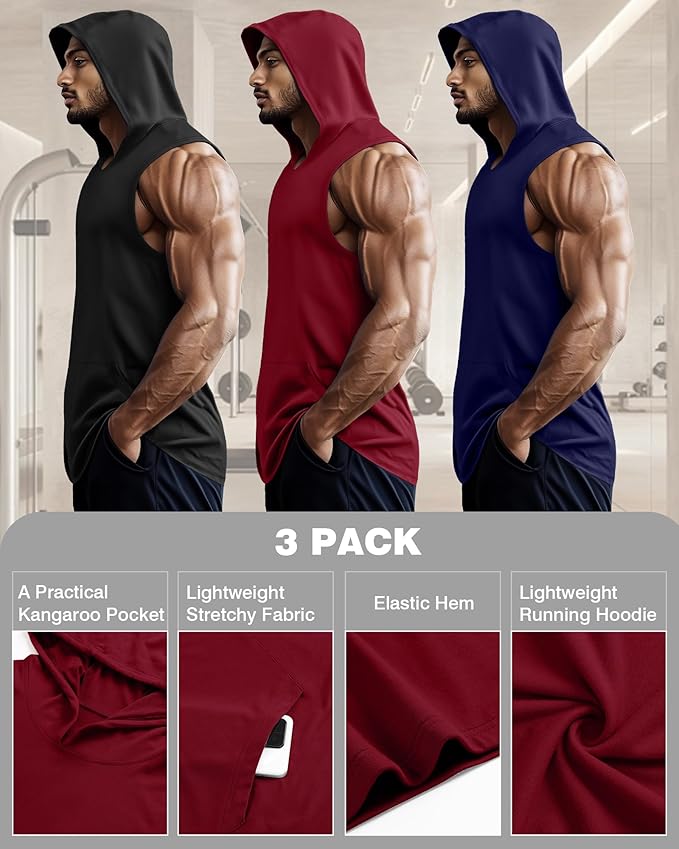 3 Pack Men's Big & Tall Workout Hooded Tank Tops, Cotton Sleeveless Gym Hoodies Bodybuilding Muscle Cut Off Shirts
