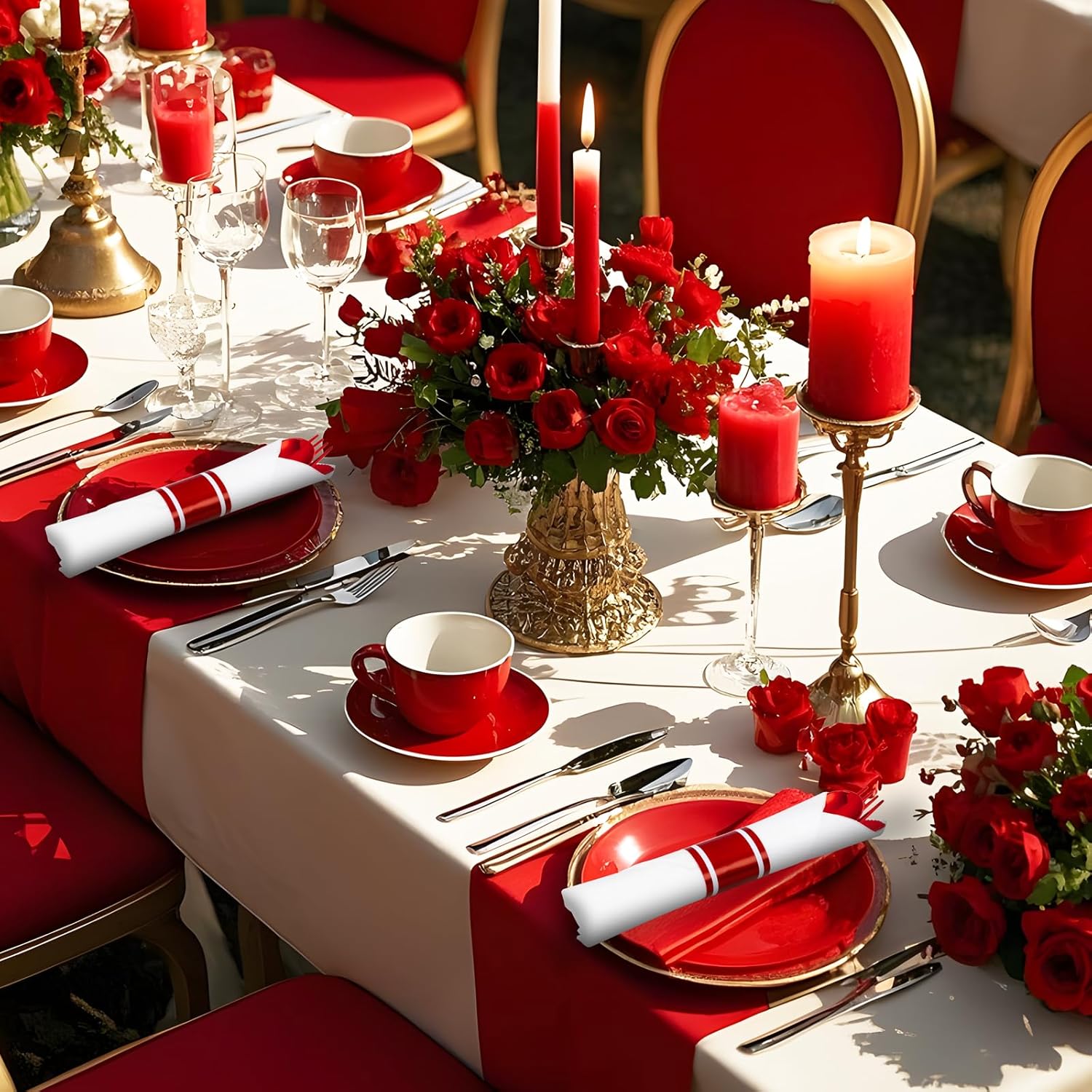 - Elegant and Convenient: The red plastic cutlery feel smooth and shiny, maintaining the standard of luxury you want. The rolled silverware disposable are very clear and convenient for you dinners. You can throw them away afterwards without having to wash them.