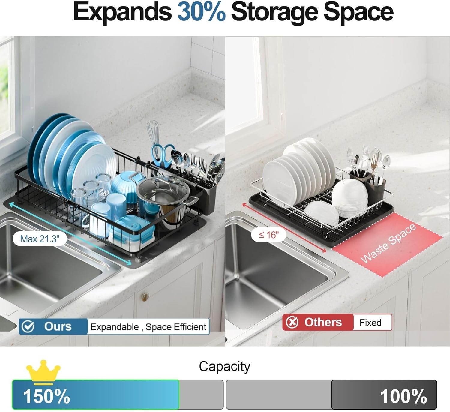 - Expandable Design Perfectly Fits Any Countertop: No more squeezing your drying rack into limited counter spaces. Featuring a smart extendable metal frame, this dish drying rack conveniently adjusts from 16.5" to 21.3", providing a custom fit for any kitchen counter size. Whether you have a compact apartment kitchen or expansive counters, enjoy versatile drying space tailored just for you.