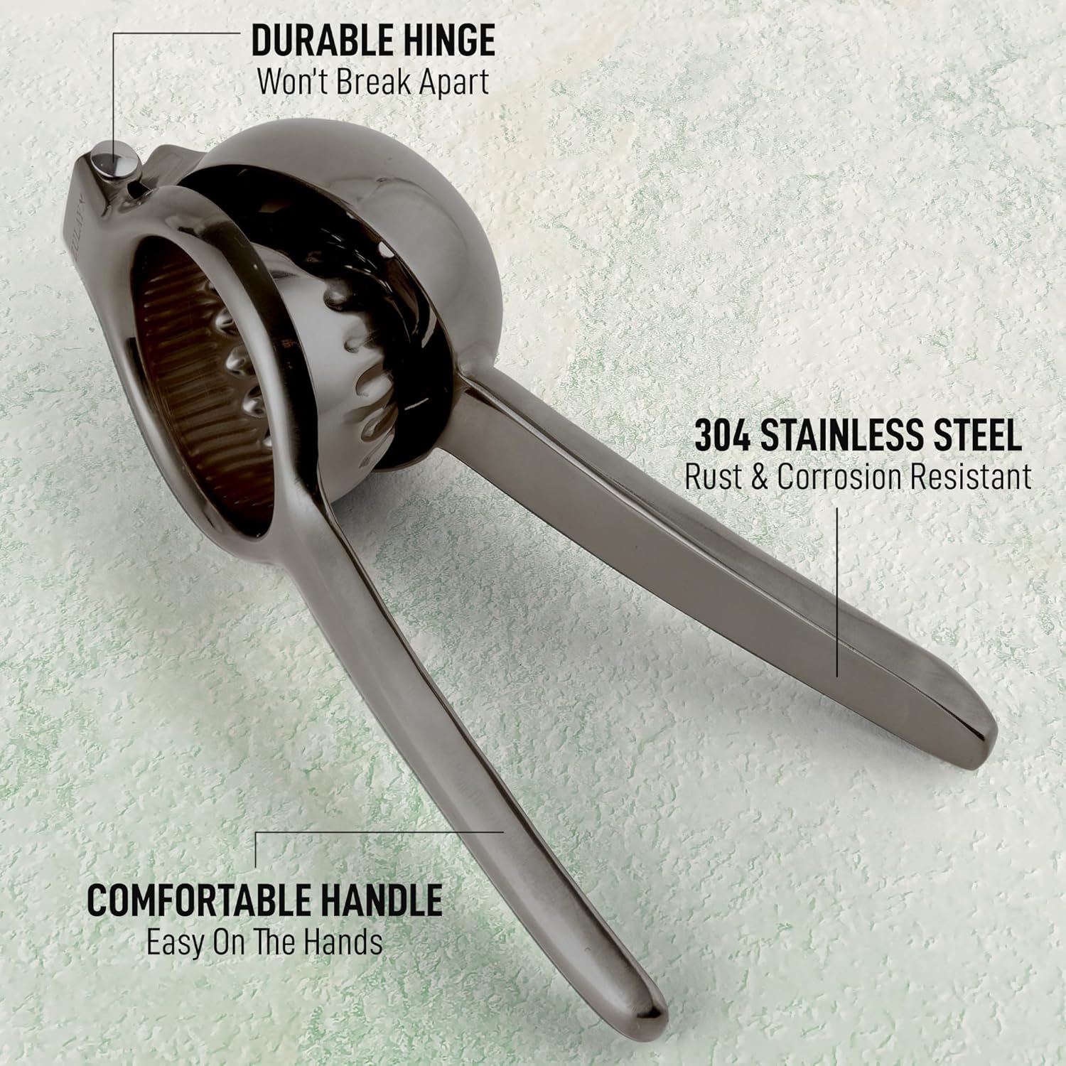 - MADE WITH HIGH QUALITY STAINLESS STEEL: This Easy-To-Use and Easy-To-Store Lemon Squeezer is built like a tank. No more bulky hard-to-clean juicers crowding the decor of your home bar or kitchen this citrus press has you covered. Whether you’re a chef or simply want a pampered squeeze you can be drinking lemonade in a just seconds.