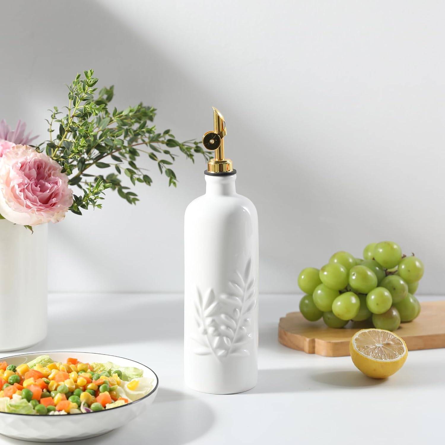 Sweejar 18 Oz Oil Dispenser for Kitchen with Gravity Spout, Ceramic Olive Oil Dispenser Bottle, Relief Opaque Vinegar Container for Evoo, Vinegar, Soy Sauce, Pack of 1(White, Gold Spout)