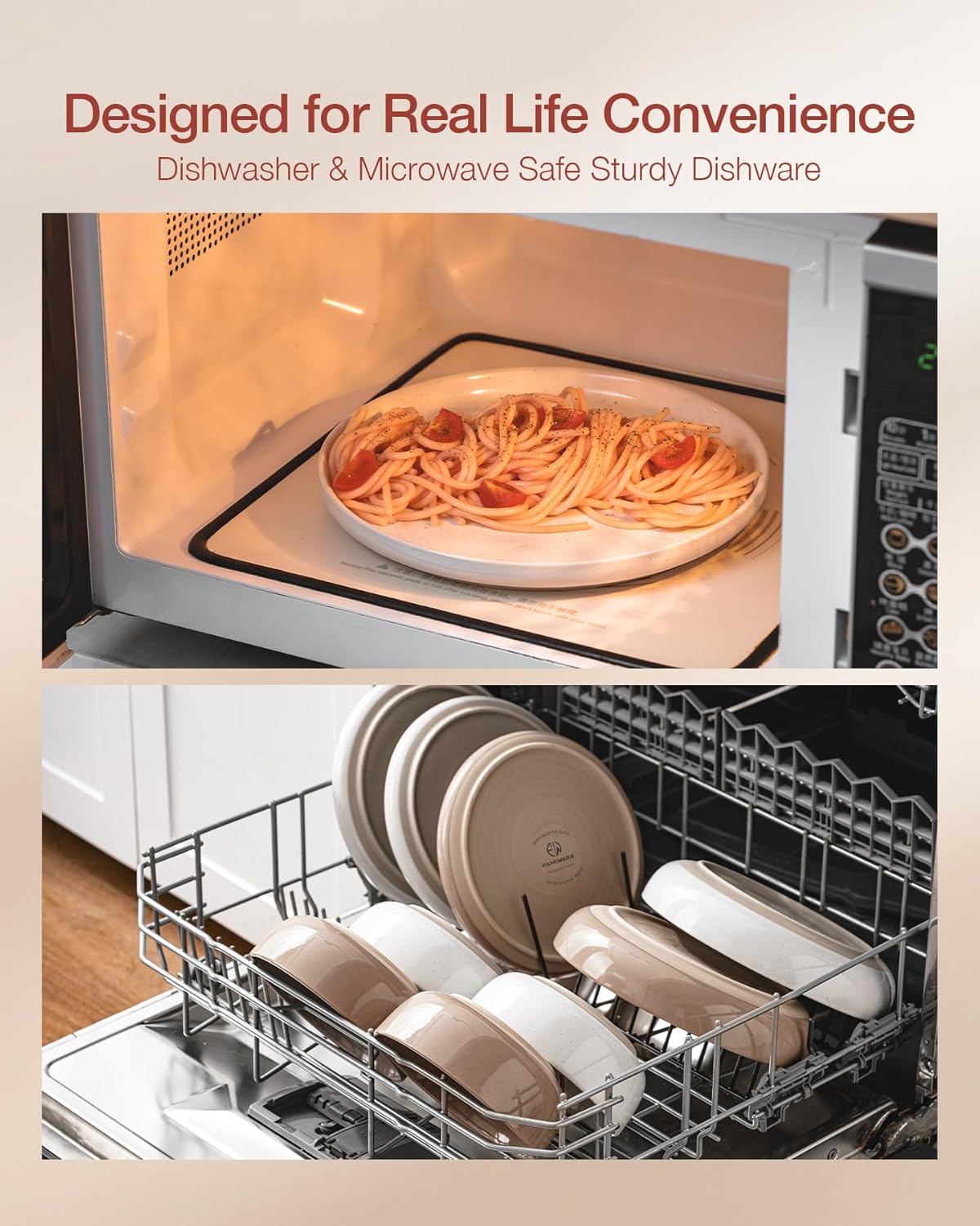 - 【SCRATCH RESISTANT】Our dinnerware glaze is fired at 2340℉ for 13.5 hours to form a strong scratch-resistant surface. No need to worry about scratches from your forks or knives.