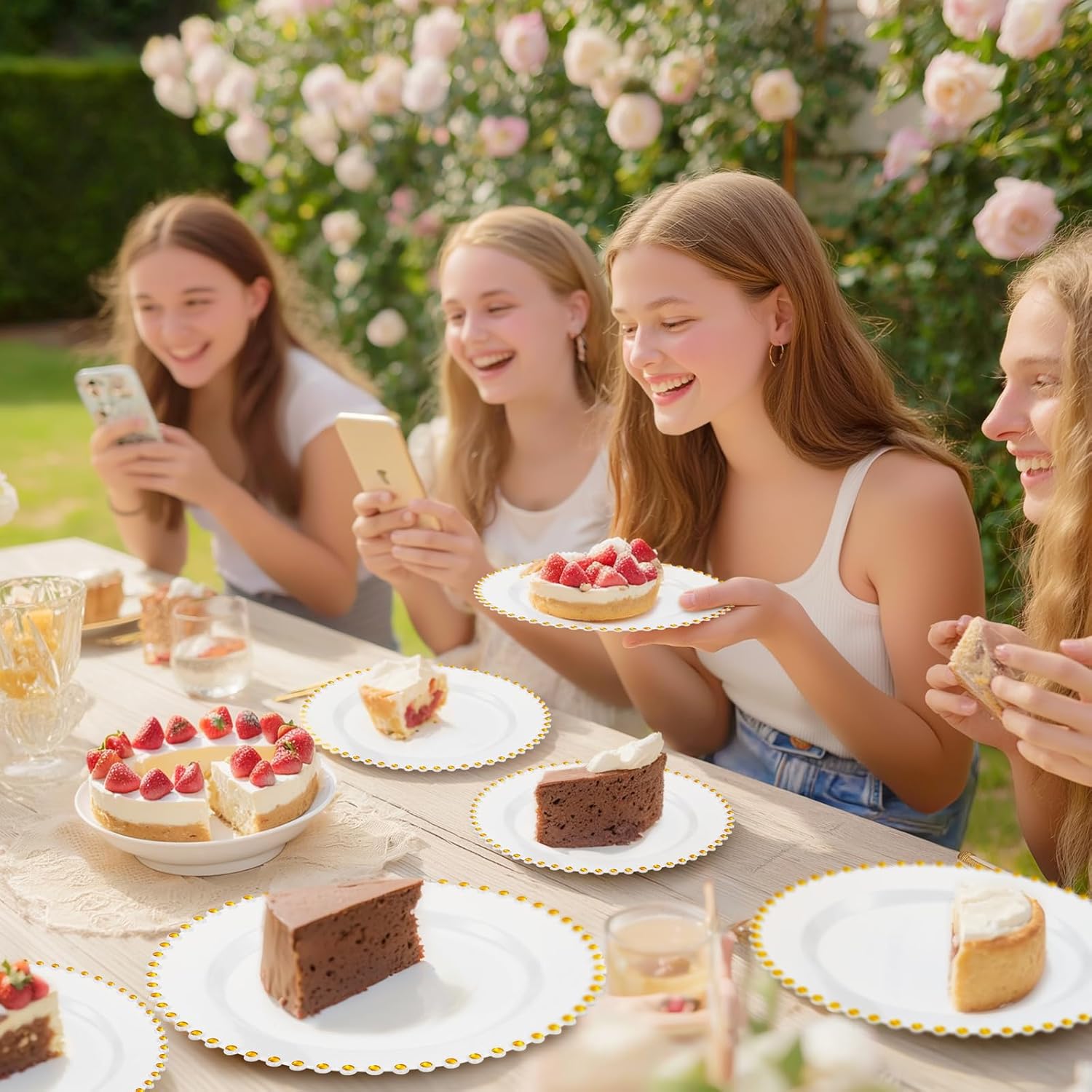 - Value Pack:This gold plastic disposable plates set includes 50 Dessert Plates 7.5inch and 50 Dinner Plates 10.25inch,100 high-quality fancy disposable plates can ensuring you have enough white and gold plastic plates for all your guests.Ideal for birthdays,weddings,or any upscale event where presentation matters