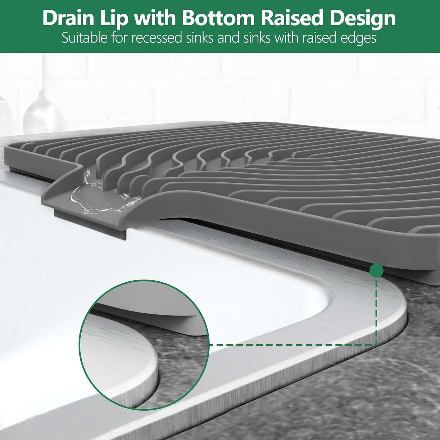 - Unique drain design: Drying matt kitchen counter work on both counter and sink. Its bottom's front is raised, fitting all sink designs like those with lips. Water gathers in the drain instead of flowing onto the counter, keeping it clean and tidy