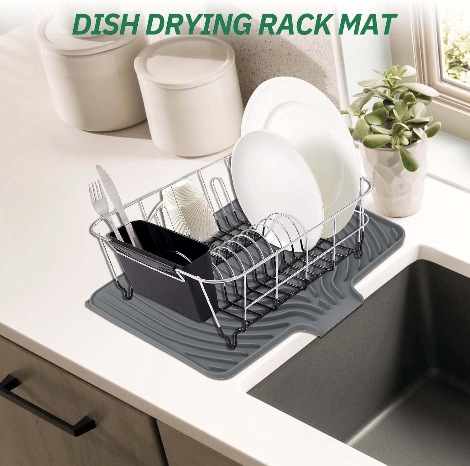 - Dish Drying Mat :17.7"L x 11.8"W x 0.59"H. Dish drying mat has a raised design for air circulation under dishes, speeding up drying. Diagonal ridges remove excess moisture. Its drain lip directs water straight into the sink, keeping countertops dry