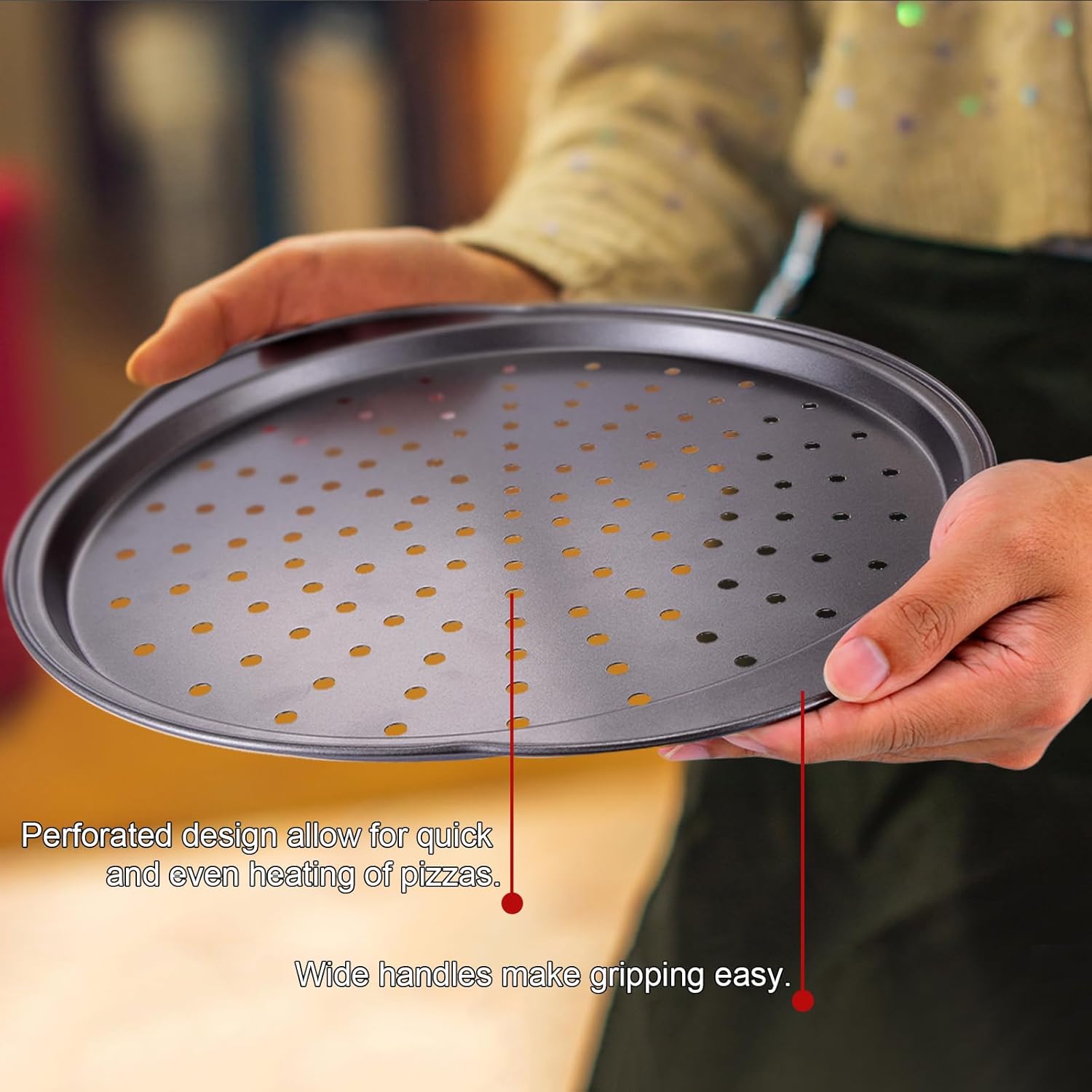 Unokit Pizza Pan for Oven - 13" 2PCS Round Carbon Steel Pizza Pan, Non-Stick Pizza Tray with Perforated Holes and Grip Handles, Dishwasher Safe, Grey