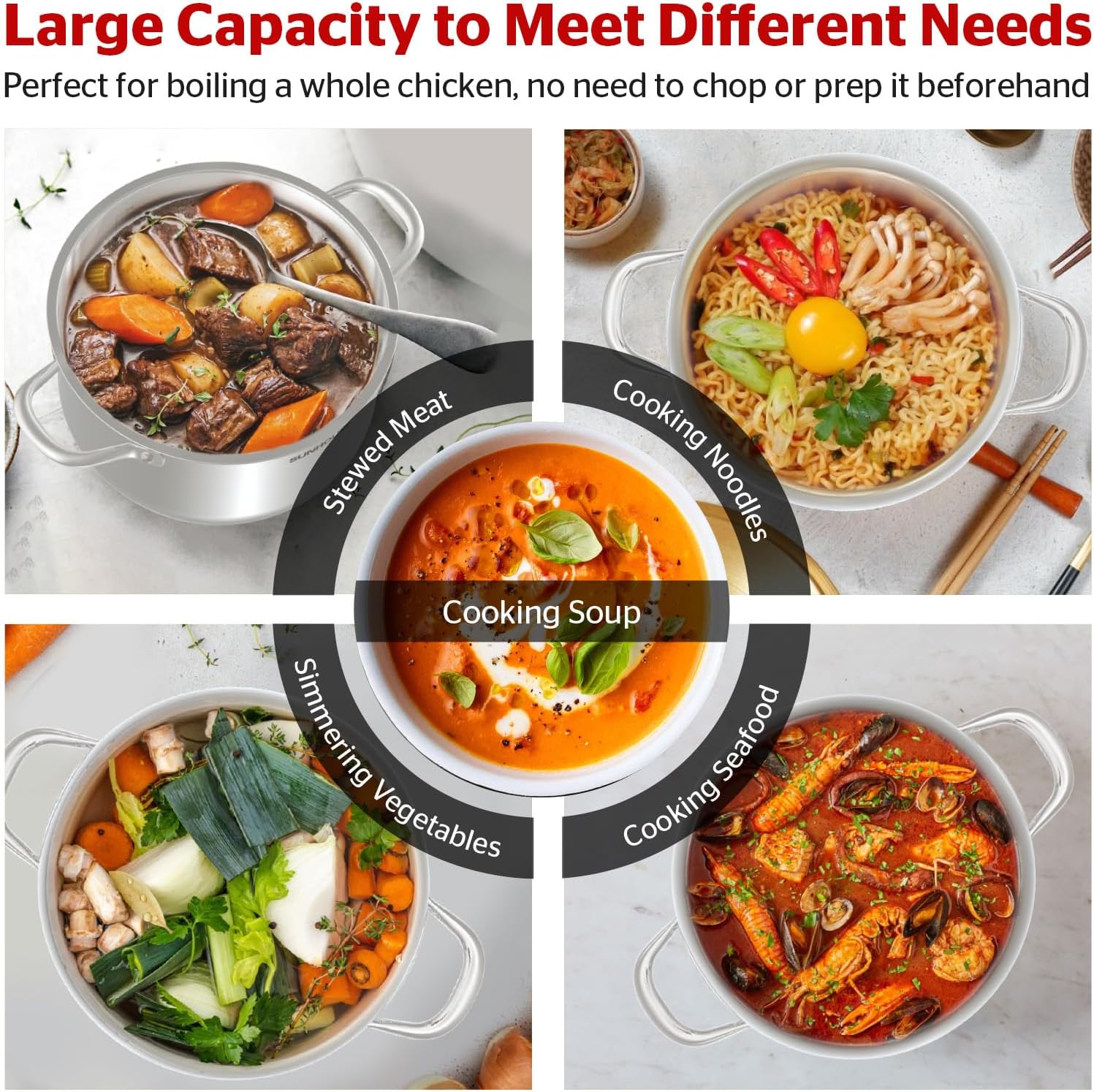 - [PREMIUM QUALITY & VERSATILITY] – Made from high-quality, non-toxic, and non-allergenic stainless steel, this heavy-duty stockpot is built to last. The 3-ply base ensures even heat distribution, making it compatible with gas, induction, ceramic, glass, and halogen cooktops. Whether you're cooking for your family or catering for large groups, this pot meets all your culinary needs.
