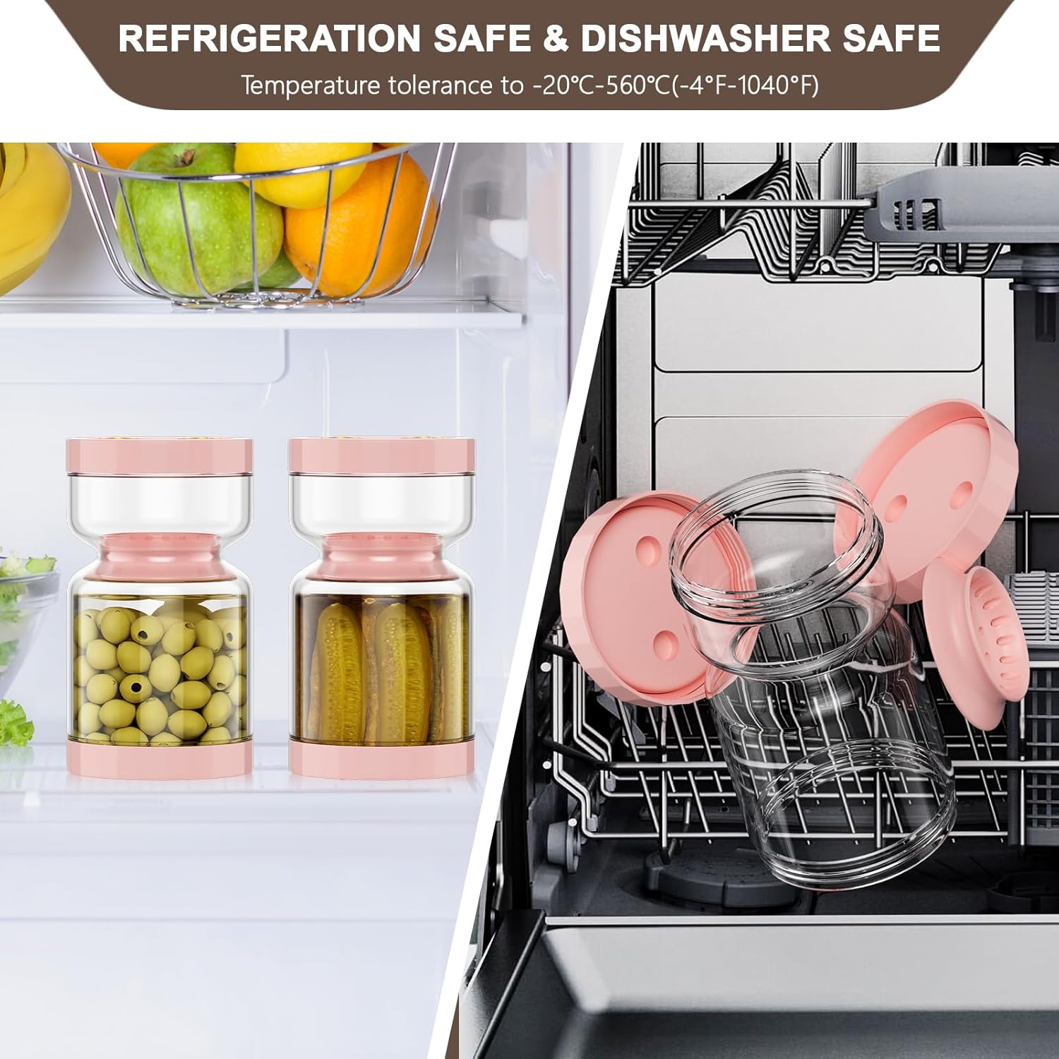 - KEEP IT FRESH AND TIDY: Our pickle container features a clever double-layer isolation design that easily separates the pickles from the pickle juice, so you don't have to worry about splashing pickle juice. Simply flip the pickle jar with strainer to drain the liquid, take the pickle, and flip it back to preserve the pickle in the brine. Say goodbye to sticky hands and splashing juice!