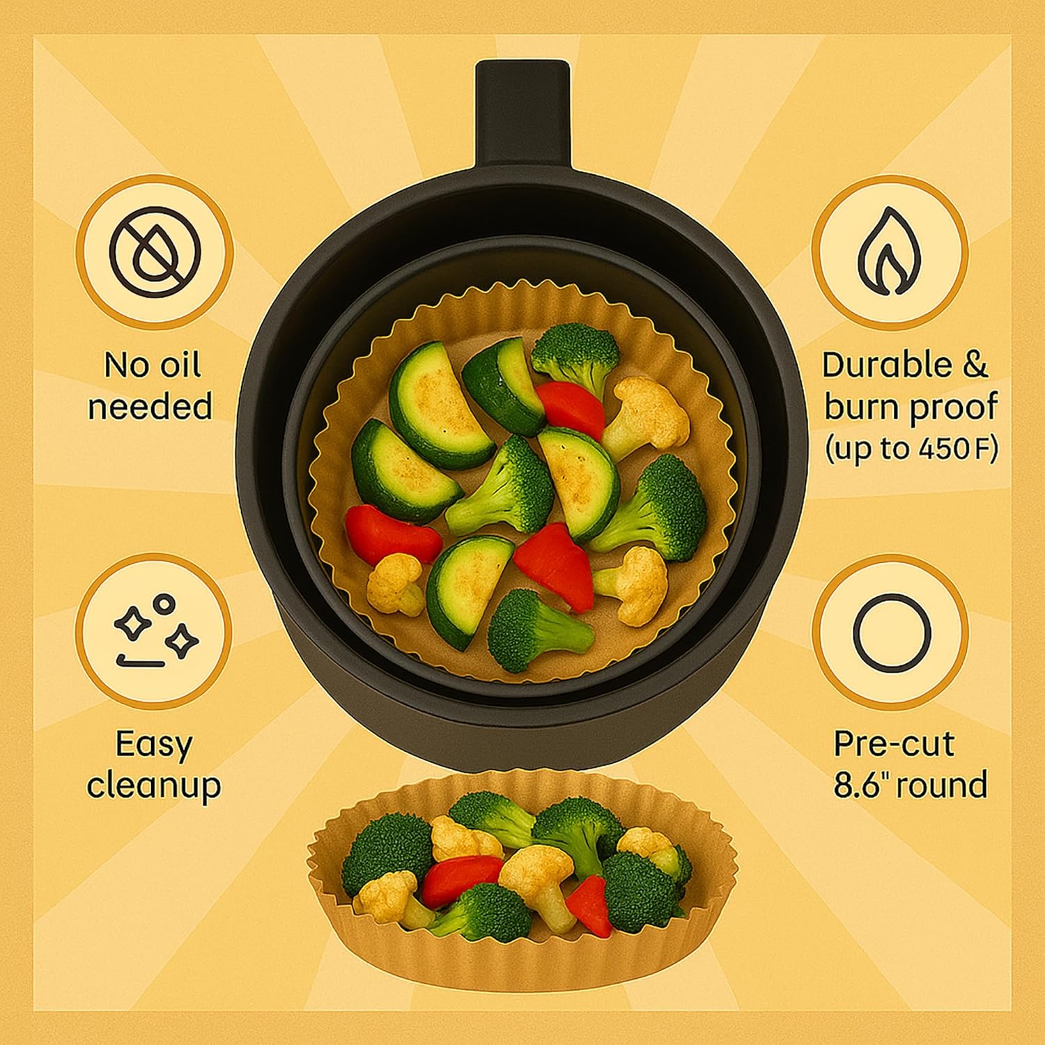 - Easy Cleanup: No more scrubbing or soaking your air fryer basket. Our non-stick parchment paper liners make cleanup a breeze, saving you time and effort after every cooking session.