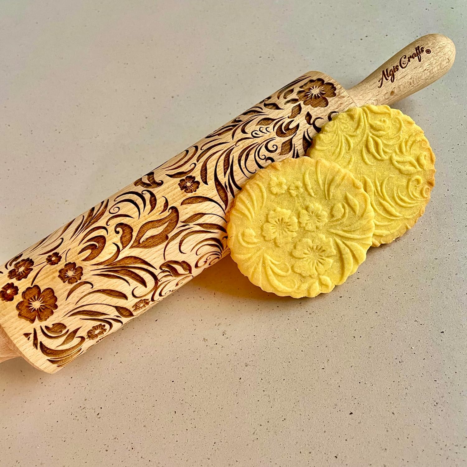 Embossing Rolling Pin VERONICA with Elegant Bloom Pattern – Dough and Clay Roller for Embossed Cookies and Pottery - Cookie and Ceramic Stamp - Baking Gifts for Women by Algis Crafts
