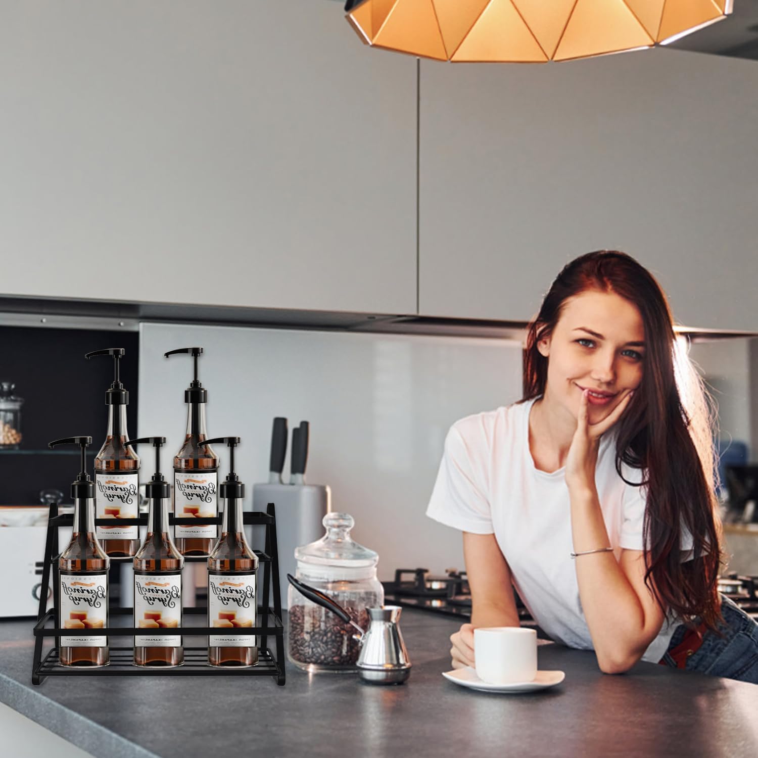 - Large Capacity :2-tier syrup rack keeps syrup of all flavors neatly organized in one place for visibility and easy access when needed.The size of each tier is about 3.9x10.4 in. It holds up to 6 syrup bottles (25.4 fl oz/750 ml) and is sturdy enough to use the syrup pump while the bottles are still on the shelf.