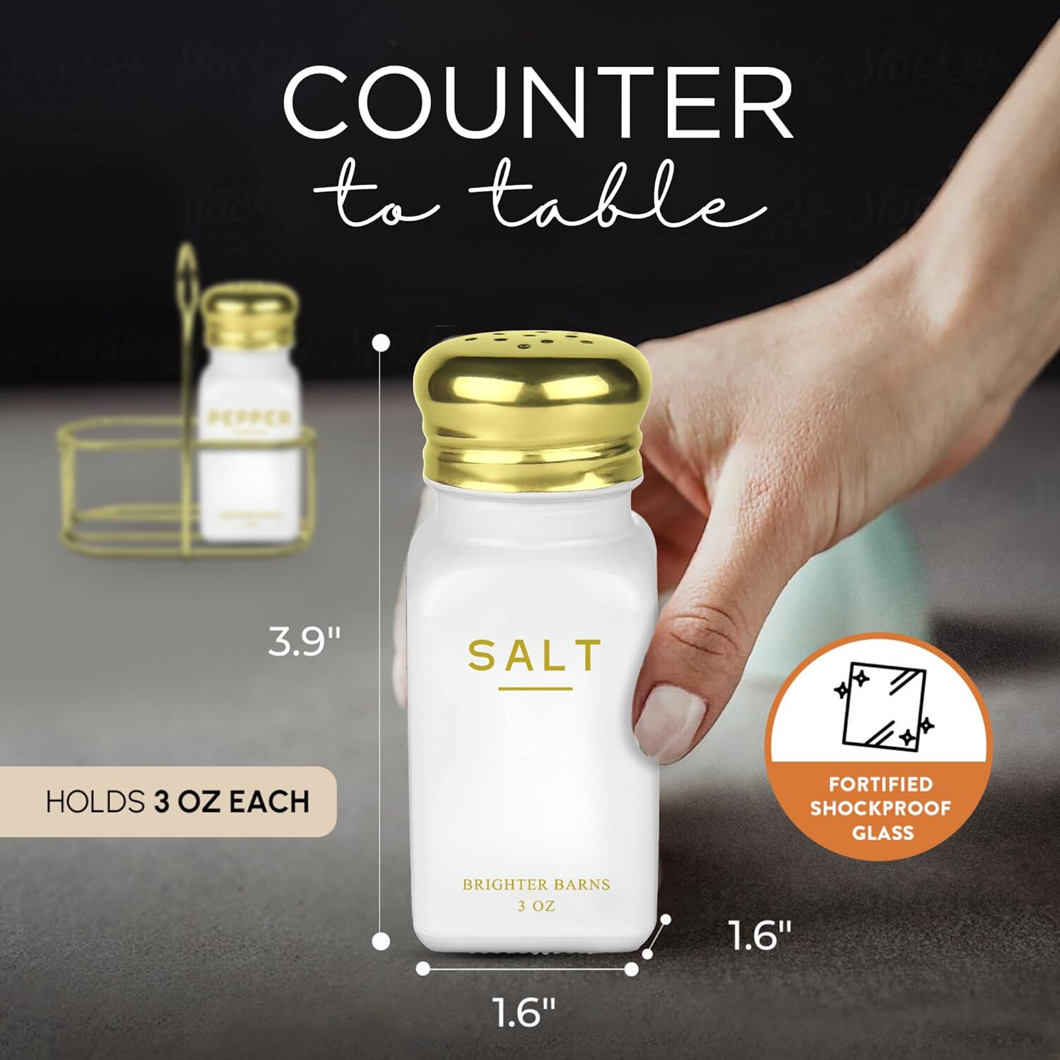 Luxury Salt and Pepper Shakers Set with Holder by Brighter Barns - Modern Kitchen Essentials, White and Gold Kitchen Accessories - Vintage Glass Shakers with Caddy for Restaurant, Airbnb (White/Gold)