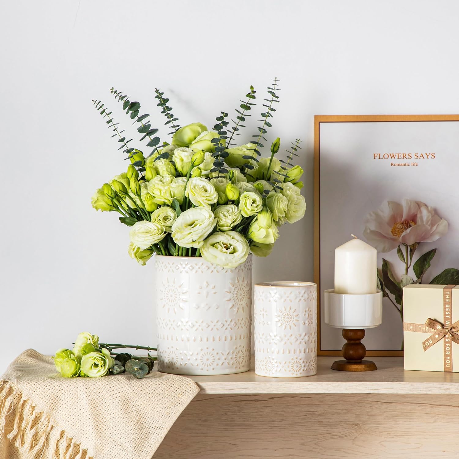 LOVECASA Utensil Holder, 7.2"+5.4" Ceramic Utensil Holder for Countertop, Large Cooking Utensil Crocks for Kitchen Counter, Farmhouse Utensil Vase for Housewarming, Kitchen Decor, Set of 2, Oasis