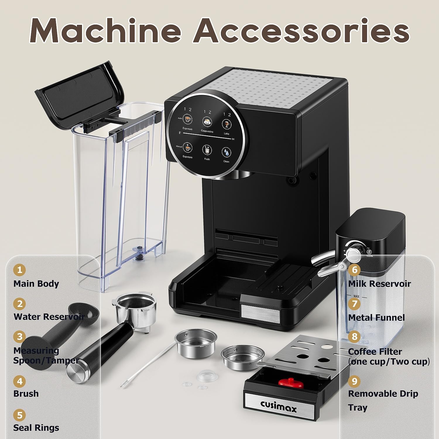 CUSIMAX Expresso Coffee Maker with Milk Frother, Cappuccino Machine Makes Espresso, Cappuccino, and Lattes with One-Touch Ease, and the Manual Mode Makes Creative Coffees with Cleaning Function