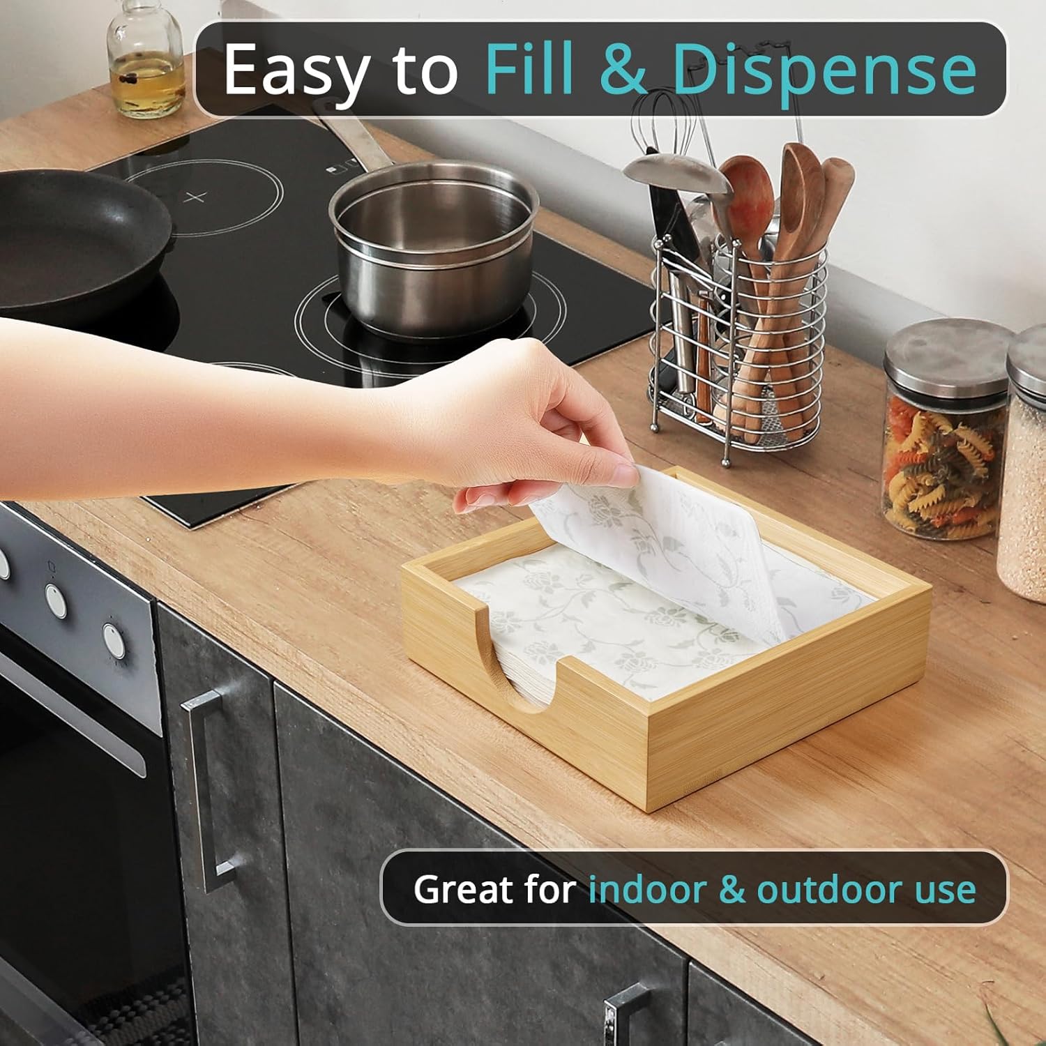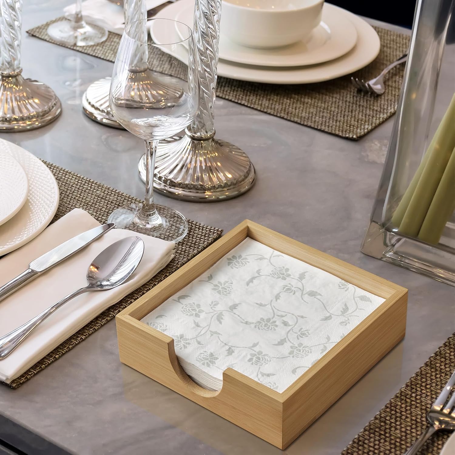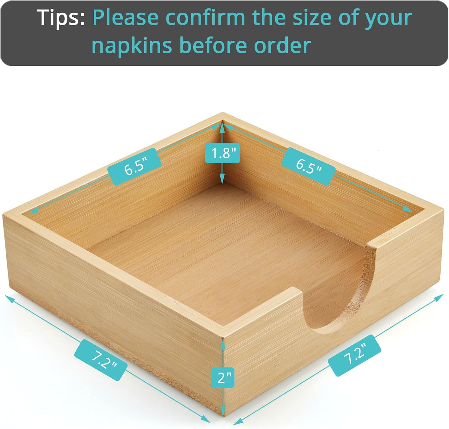 - Perfect Size for Various Napkins: This wooden napkin holder measures 7.2" by 7.2" (Internal size: 6.5" by 6.5") and is the perfect size to hold luncheon, dinner, beverage or cocktail napkins, coasters, or memos, and also fits other standard guest towel/buffet napkins. PLEASE CONFIRM THE SIZE OF YOUR NAPKINS BEFORE ORDER.