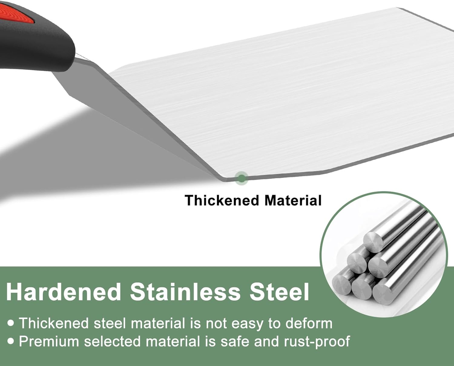 - Premium Stainless Steel: This commercial grade spatula stainless steel is thickened and hardened, sturdy steel blade eliminates flex for smash burgers and tough scraping tasks