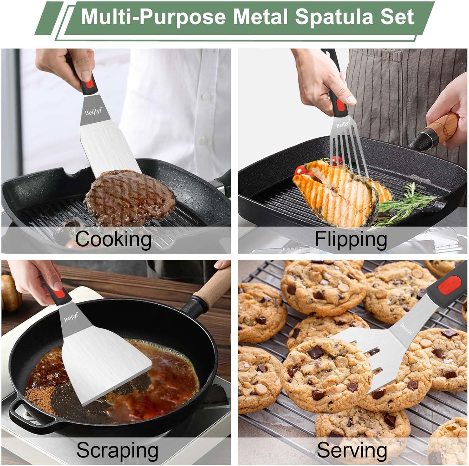 - Multi-Purpose Metal Spatula Set: 4-piece stainless steel cooking utensil set includes a turner, wide spatula, fish spatula and mini cookie spatula, small metal spatulas are suitable for cast iron skillet and kitchen use for any type of cooking