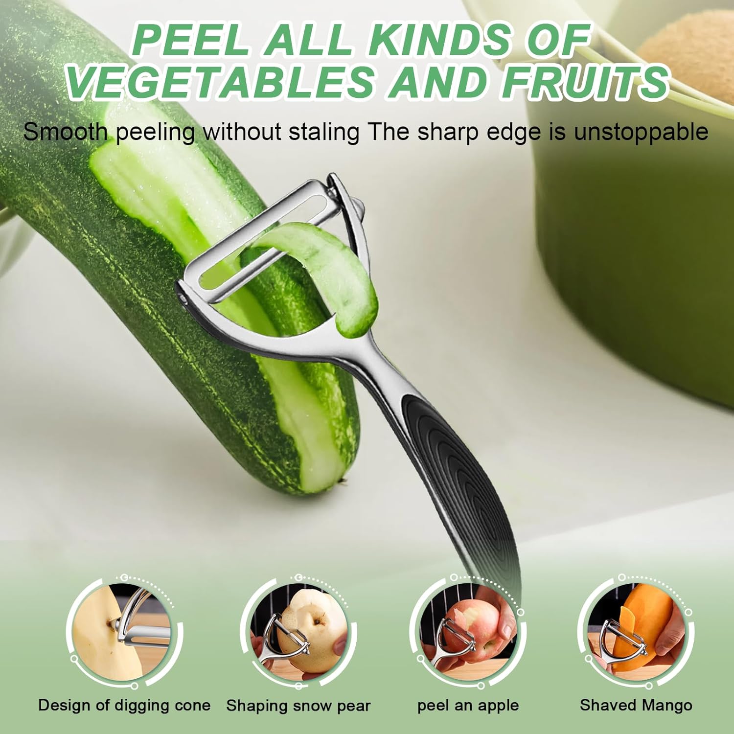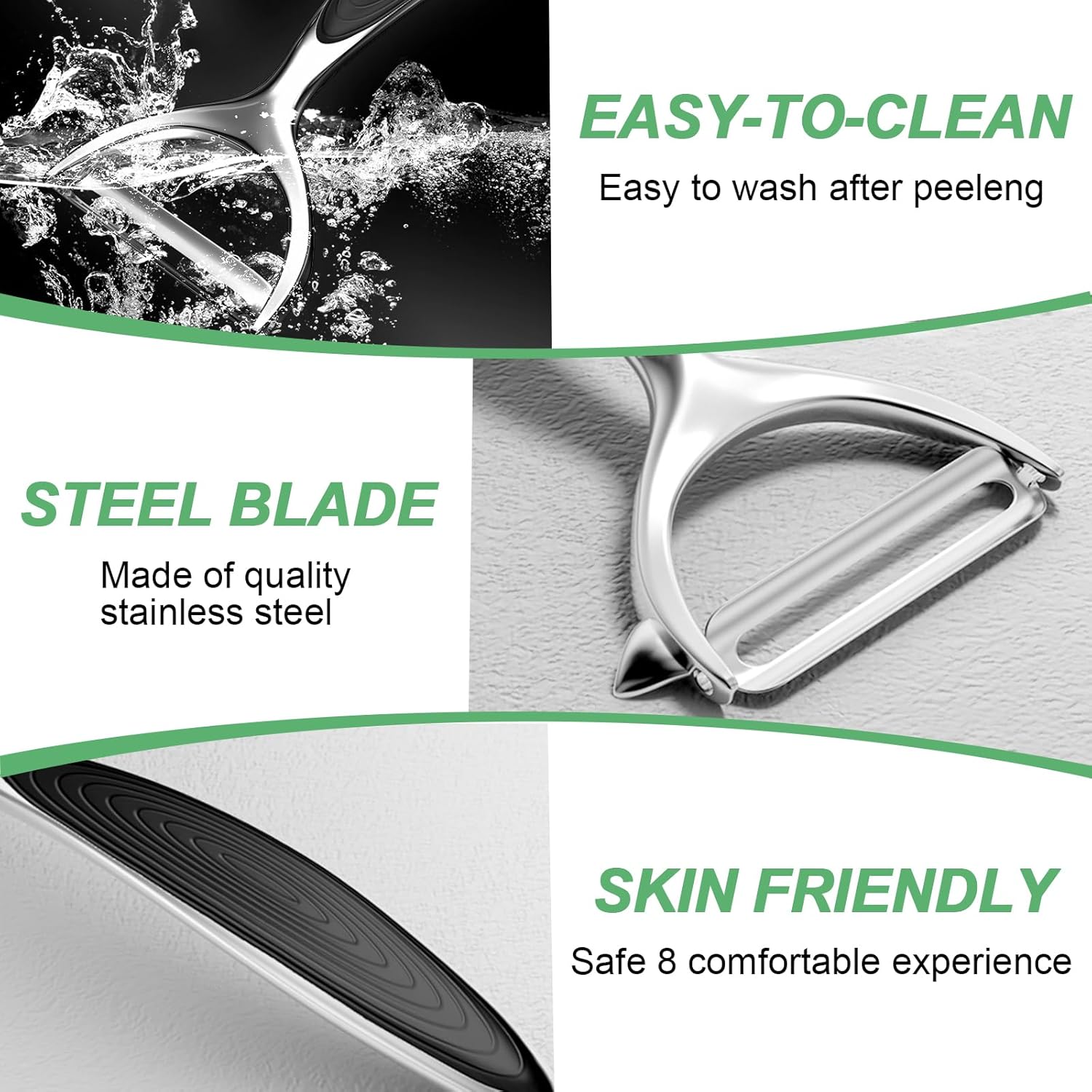 - Effortlessly peel even tough skins with razor-sharp stainless steel blades! Perfect for potatoes, carrots, apples,tomatoes and rest veggie . The Y-shape tackles flat surfaces, while the I-shape glides through curves – no wasted flesh, just smooth peeling every time.
