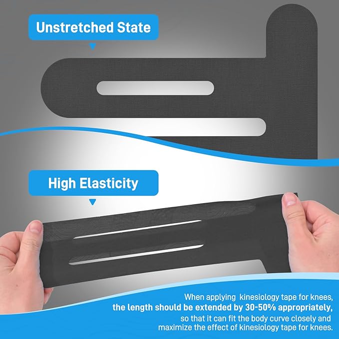 - 【Breathable and latex-free】The precut for knee kinesiology tape has good breathability and high-intensity stretch adjustment. The material is light and can fit the contour of the knee without affecting the freedom of movement. Sport tape for knees has good fit, soft and fits the skin, and is comfortable to wrap without shifting or falling off.
