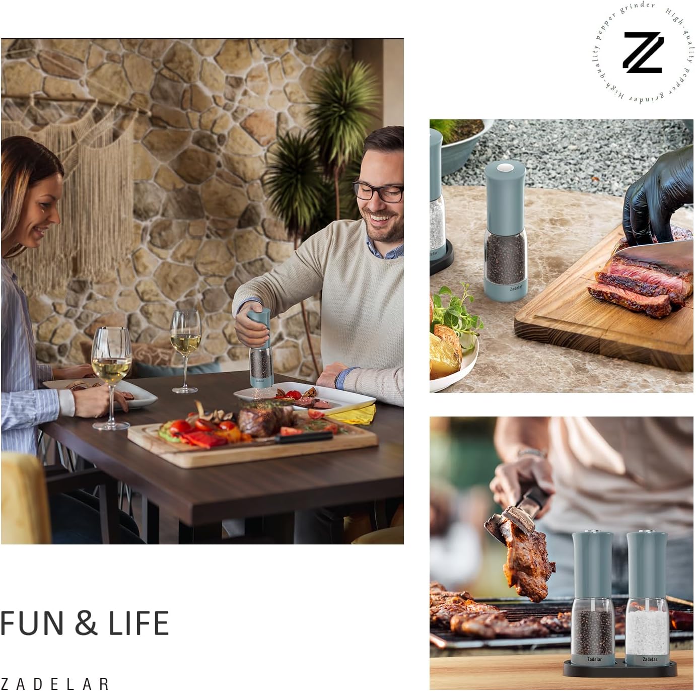 - [Amazing gift]Whether for personal use or as a gift, electric salt and pepper shakers rechargeable is a practical and stylish choice that embraces a healthier and more sustainable lifestyle.The salt and pepper grinder set electric package includes 1 x Dual Storage Base, 1 x Cleaning Brush,1xUser Manual,1xUSB-A to USB-C Cable.All Zadelar Products are covered by a 360-day hassle-free replacement or refund policy.Our support team is standing by with 12 hours fast reply.