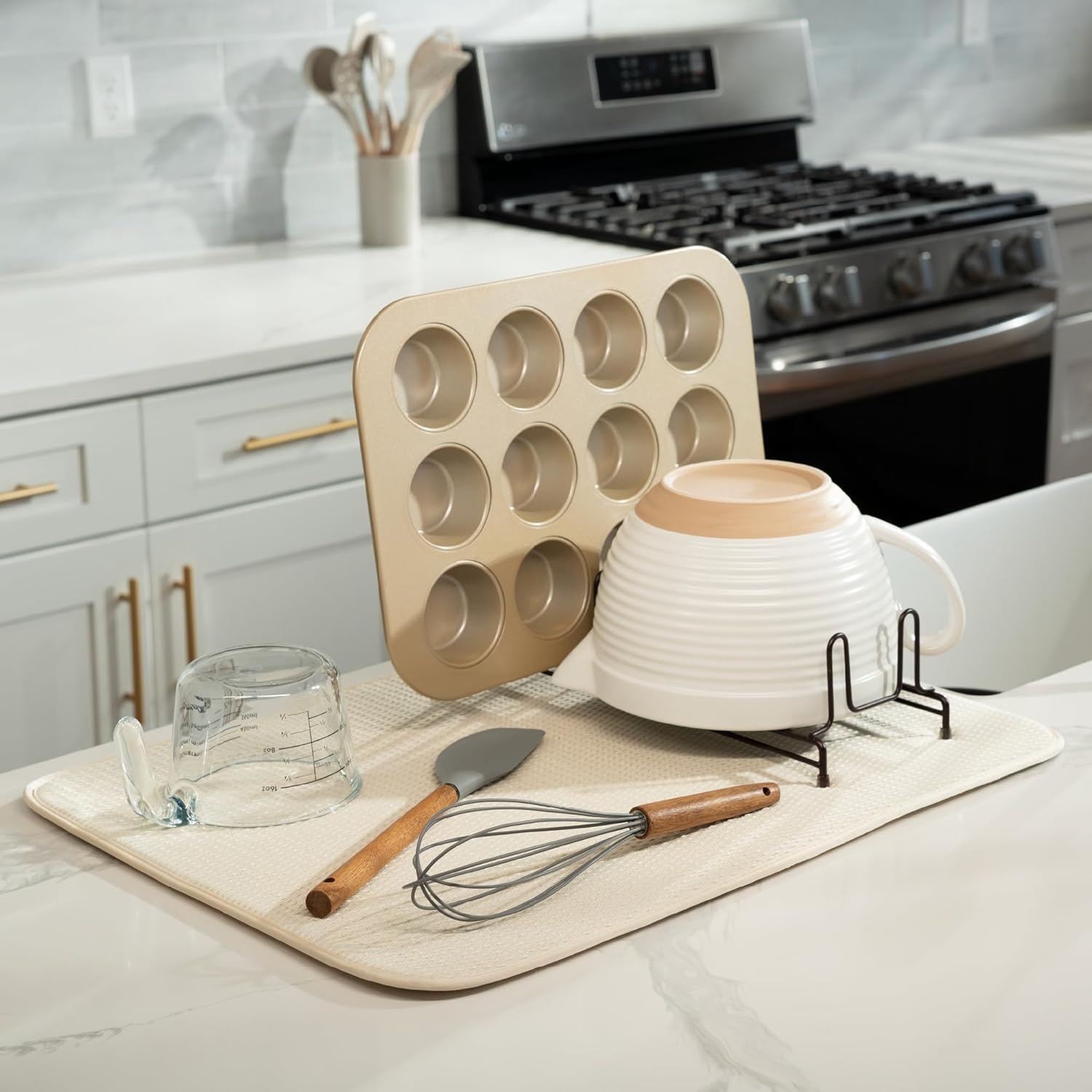 - Dish drying mat for kitchen counter protects surfaces from scratches and scuffs when placed under kitchen gadgets; multipurpose drying pads can be used as an appliance slider for a mixer or blender
