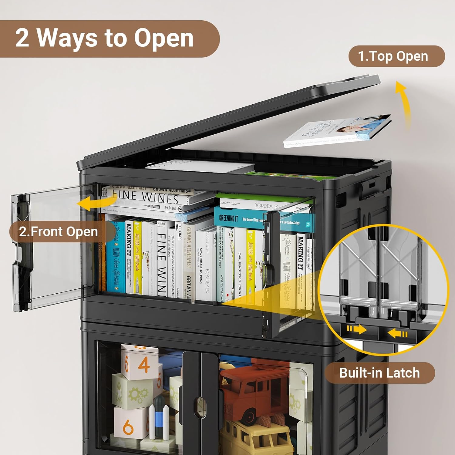 - [Dual Access Ways] Broview plastic storage bins with lids are designed with two opening ways - Front doors or top lid. The handle of the front door has a lock design, the storage cabinet can be locked or unlocked by pressing the handle. The front doors is convenient for daily use, while the top lid allows for quick access to larger items such as clothes and blankets.