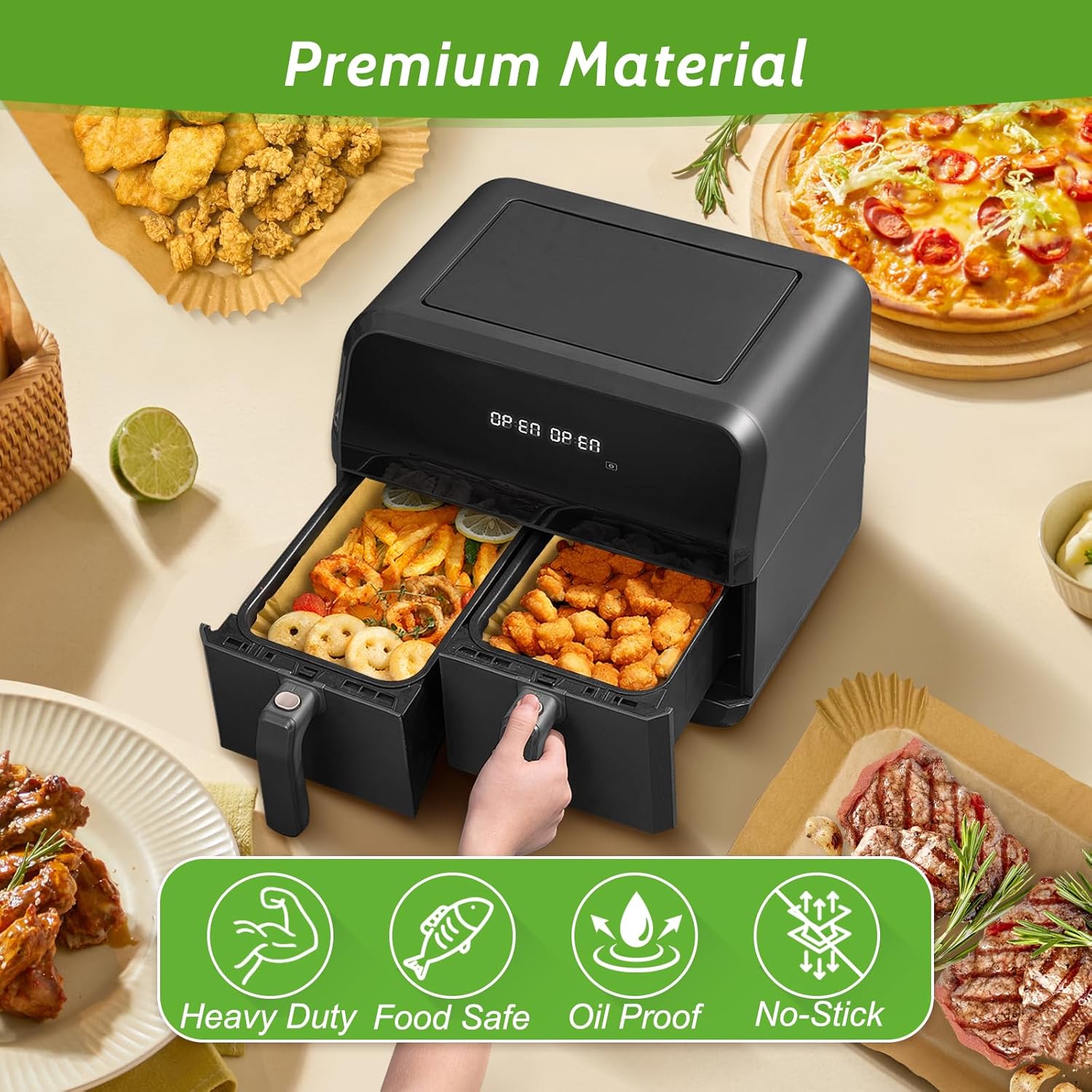 - 【Heavy Duty Liners】:Made of high strength thick paper and silicone coating, these air fryer liners disposable can withstand a temperature up to 428℉, they won’t be torn or damaged during the cooking process.