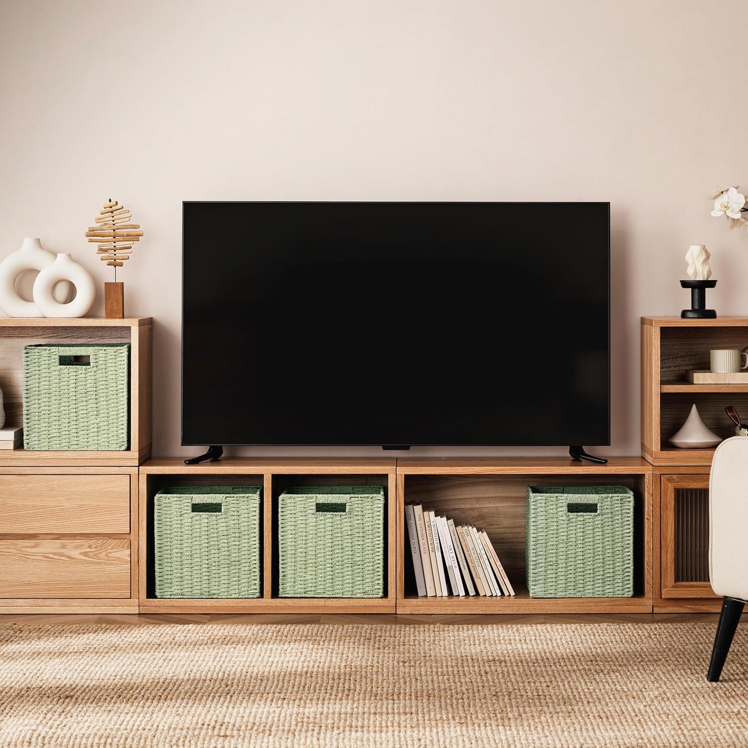 UBBCARE 3 Pack Wicker Basket, 11L×11H×10.5W inch Woven Paper Rope Storage Baskets for shelves, Foldable Cube Storage bin with Handle, Storage Basket for Organizing & Decor, Green