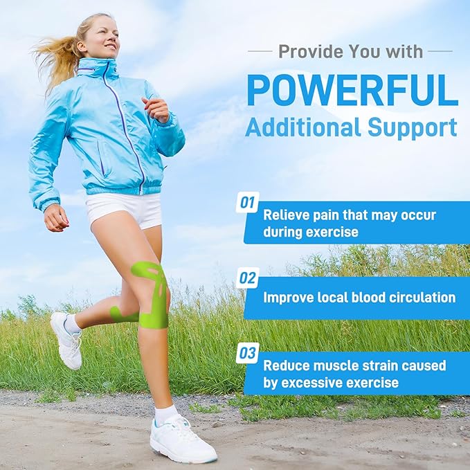 - 【Increase Support, Strengthen and Stabilize the Knee Joint】Kinesiology tape for knees is a functional muscle tape designed for various sports, especially for outdoor sports. Knee tape is mainly used to increase support, strengthen and stabilize the knee joint, improve incorrect movement patterns, effectively limit the range of motion of athletes' joints and muscles, prevent muscle strain, and relieve pain that may occur during exercise.(Green 20pcs)