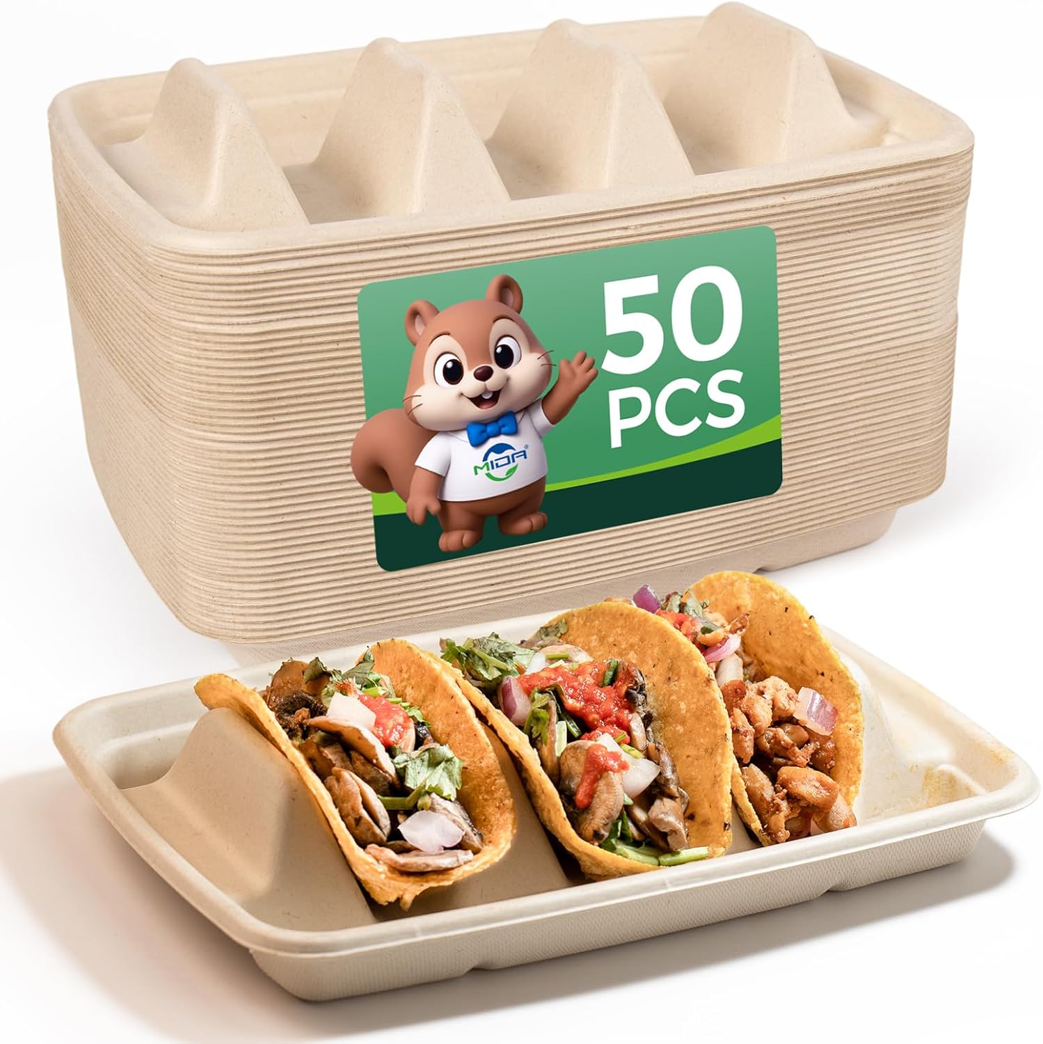 50-Pack 100% Compostable Biodegradable Paper Taco Holders, Eco-Friendly Disposable Paper Taco Tray for Taco Tuesday, Lazy Susan Taco Bar (50-Pack)