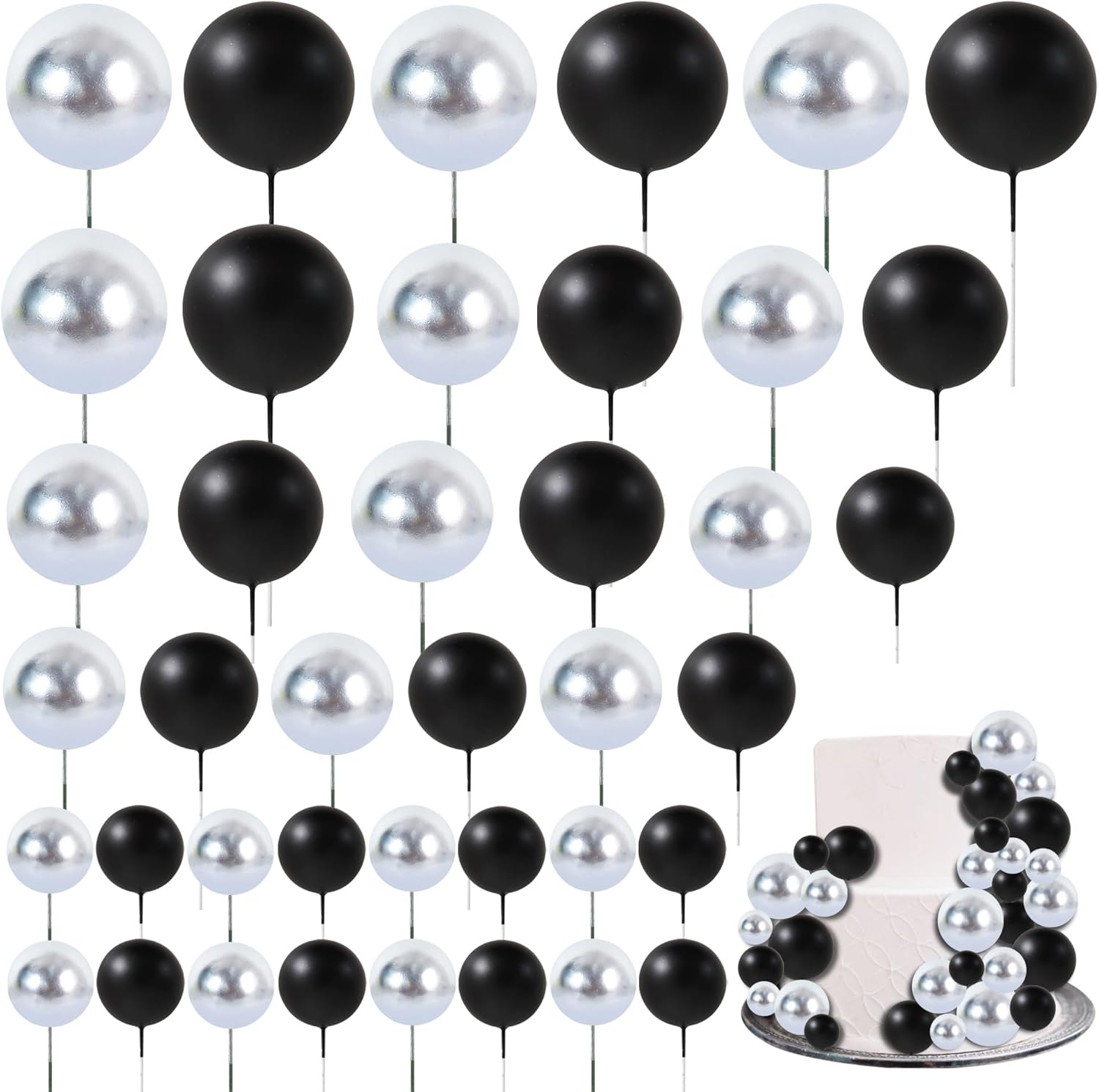 BEISHIDA 40 Pcs Ball Cake Toppers Mini Balls Cake Decorations Black Silver Foam Balls Sticks DIY Cake Topper for Baking Congrats Grade 2025 Graduation Birthday Retirement(Black Silver)