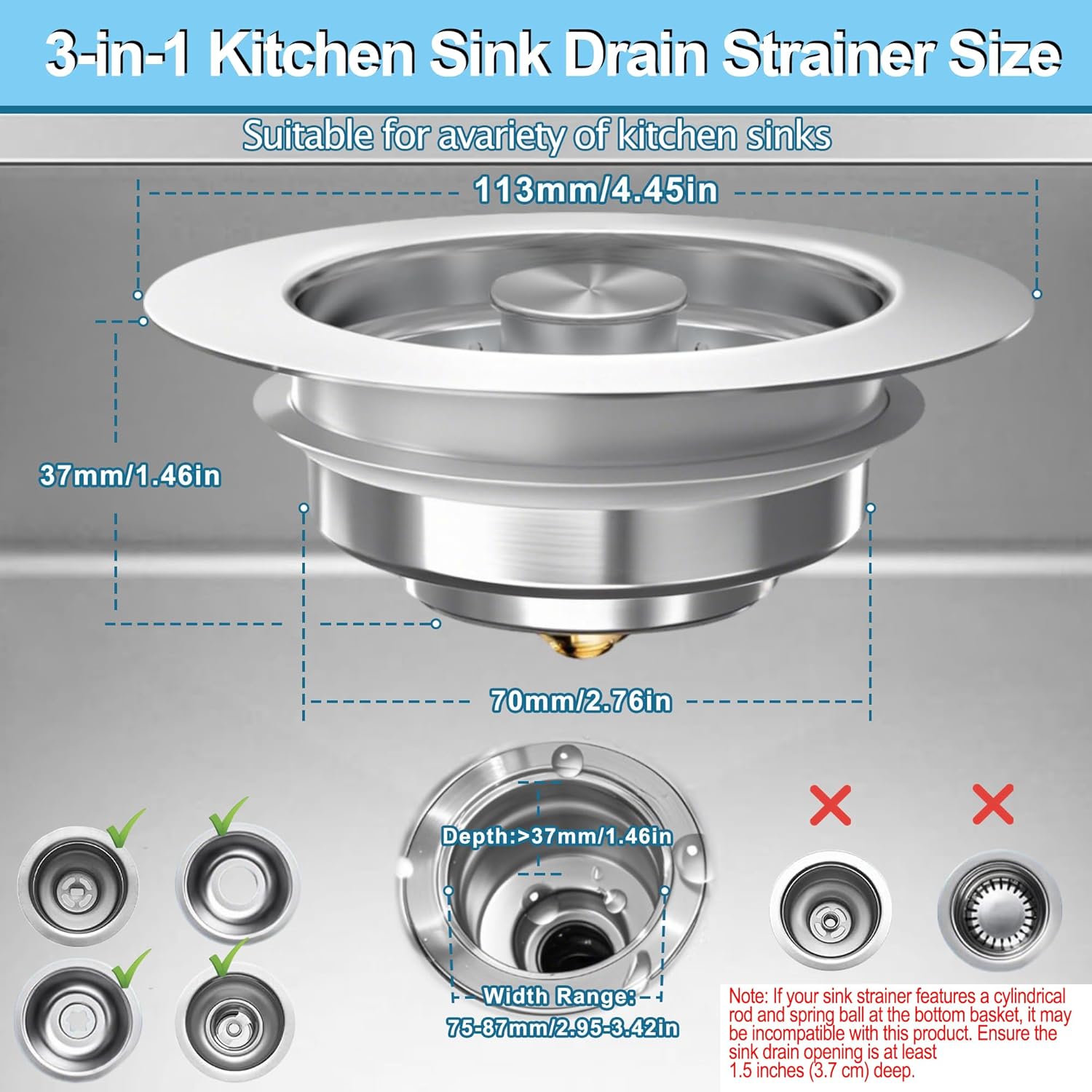 - ALL-IN-ONE KITCHEN SINK STRAINER & STOPPER: Our 3-in-1 kitchen sink drain strainer and stopper works as a food catcher, drain plug, and stopper. Just press to seal or release water—no need for multiple sink tools.