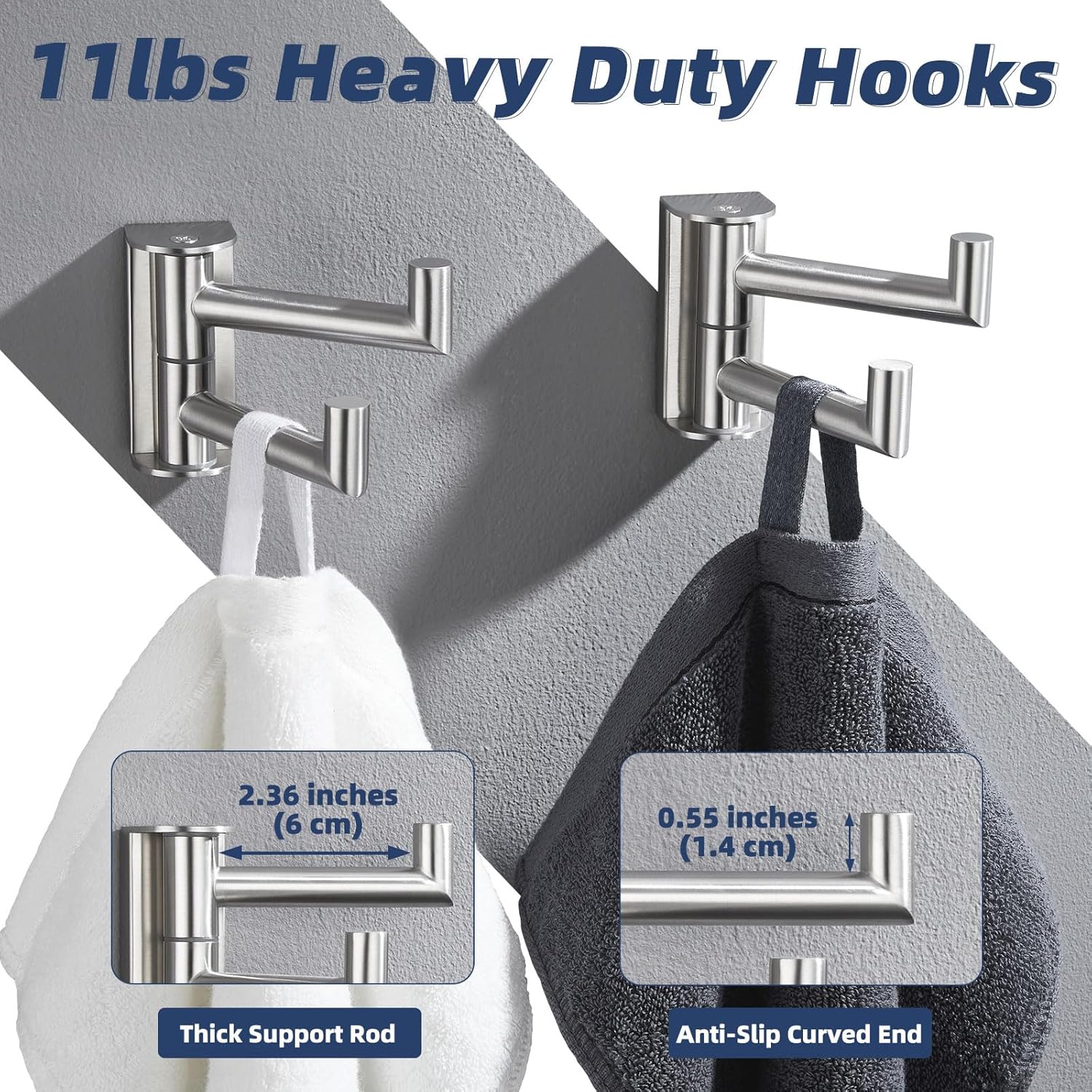 - PRACTICAL & STURDY CONSTRUCTION: 2-3/8”(60 mm) support rod with upward end hook, make dual towel hanger hang towels, clothes, bags firmly without falling. Rotary interface embedded with quality gasket to avoid wear and noise during use