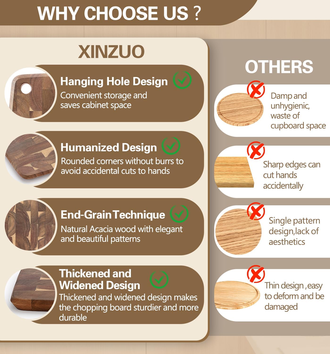 XINZUO Small Acacia Wood End-Grain Kitchen Cutting and Serving Board, for Kitchen, 14" x 9" Reversible Wooden Chopping Board for Meat, Cheese, Fruit & Vegetables,Easy to Clean(Rectangular)