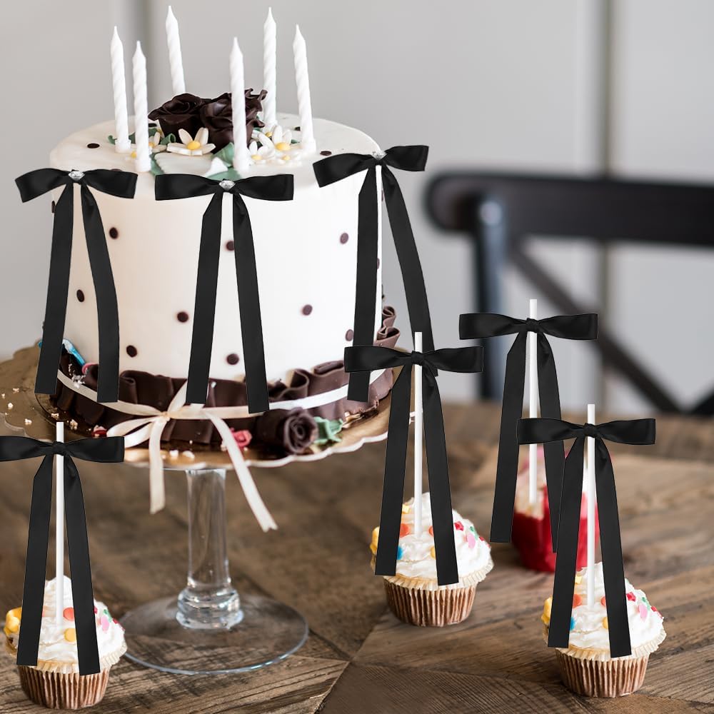 Bow Cake Toppers, 10 Pcs Large Black Bows Cupcake Toppers Themed Party Decorations, Black Birthday Cake Decorations for Wedding Baby Shower Party Supplies