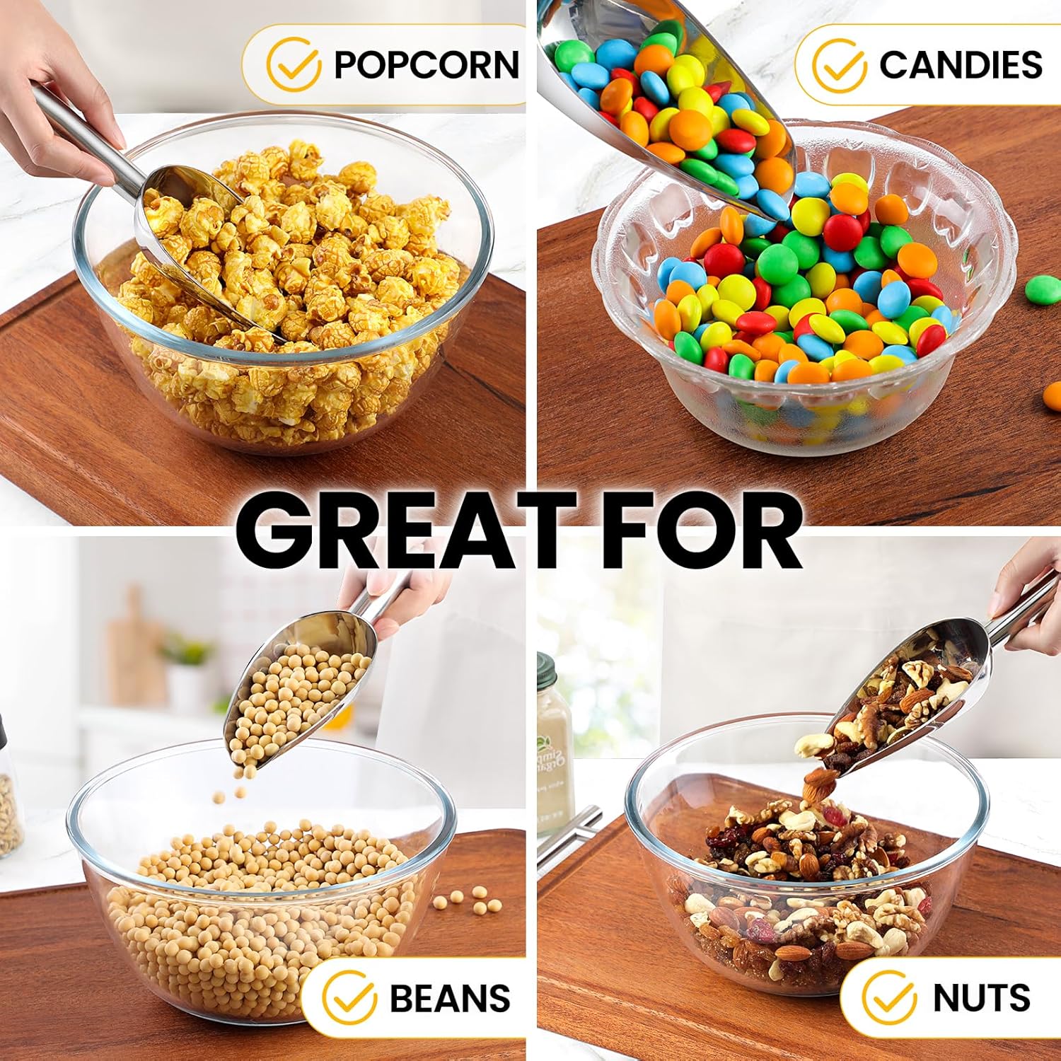 - MULTI-PURPOSE: Our ice scoop isn’t just for ice cubes. It’s also perfect for handling pet food for dogs, cats, and birds. Plus, it handles bulk items such as sugar, beans, cereal, and nuts with ease. Ideal for both commercial settings and home use!