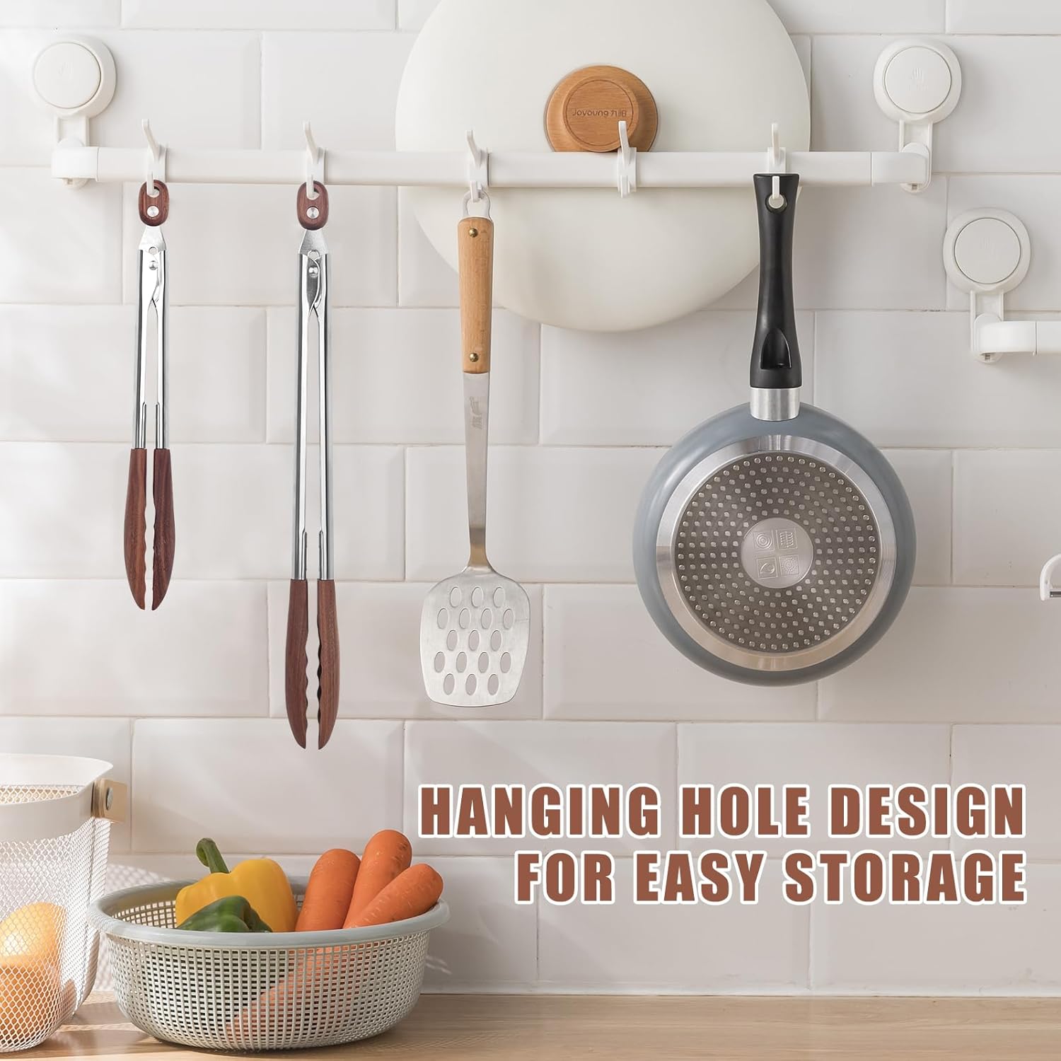 - 【ELEGANT DESIGN SPACE SAVING EASY TO CLEAN】:The combination of sleek stainless steel and warm walnut wood in these wooden cooking utensils offers a stylish addition to modern or country kitchen décor, making these wood tongs not just functional still a beautiful utensil collection you’ll want to display. They effortless to clean,adding convenience to your kitchen routine, with a convenient locking mechanism,with Wood Tip stay closed when not in use, allowing for compact storage in your kitchen drawer or hanging from a hook