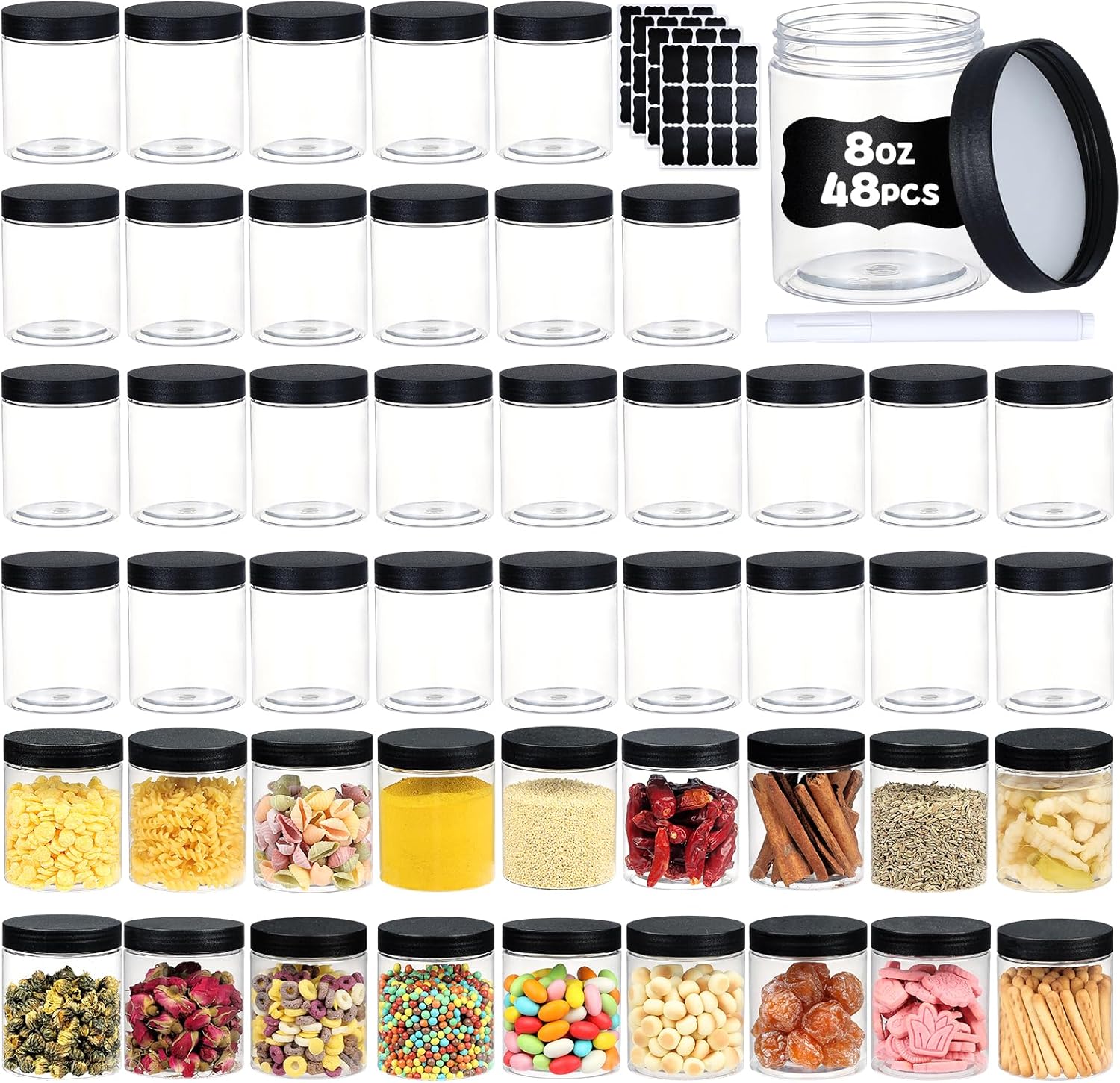 - 【Value Pack】There comes with 48 pieces of 8oz plastic jars, they are round with wide mouth which can easily meet the storage needs of a variety of items, also includes with a marking labels that can help you to figure out what items inside the jar and make a quick choice
