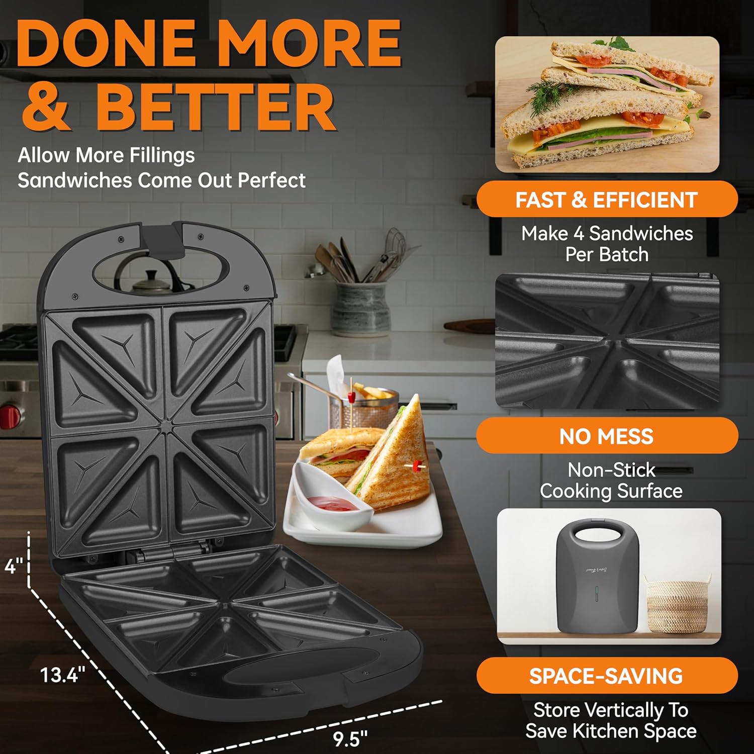 - [Quick Sandwich Maker]: Indulge in 8 hot pocket sandwiches in just 5 minutes or less! Start your day stress-free by crafting 4 slices of nutritious, gourmet-pressed sandwiches with perfect toast. Enjoy consistently delightful sandwiches each time, thanks to the diagonal indentation that toasts and seals the bread for hassle-free slicing. Plus, effortlessly whip up other meals like omelets and French toast.